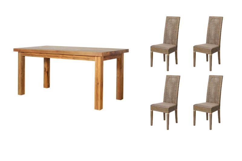 KAJAオリジナルの「CHISTA/オールドチーク ダイニングテーブル(4本脚・W180)」に、人気の「CERES(セレス)シリーズ」チェアを4脚組み合わせた、特別なダイニングセットです。 天然素材の魅力を引き出した家具同士が調和し、暮らしにやさしく寄り添うダイニングに。
