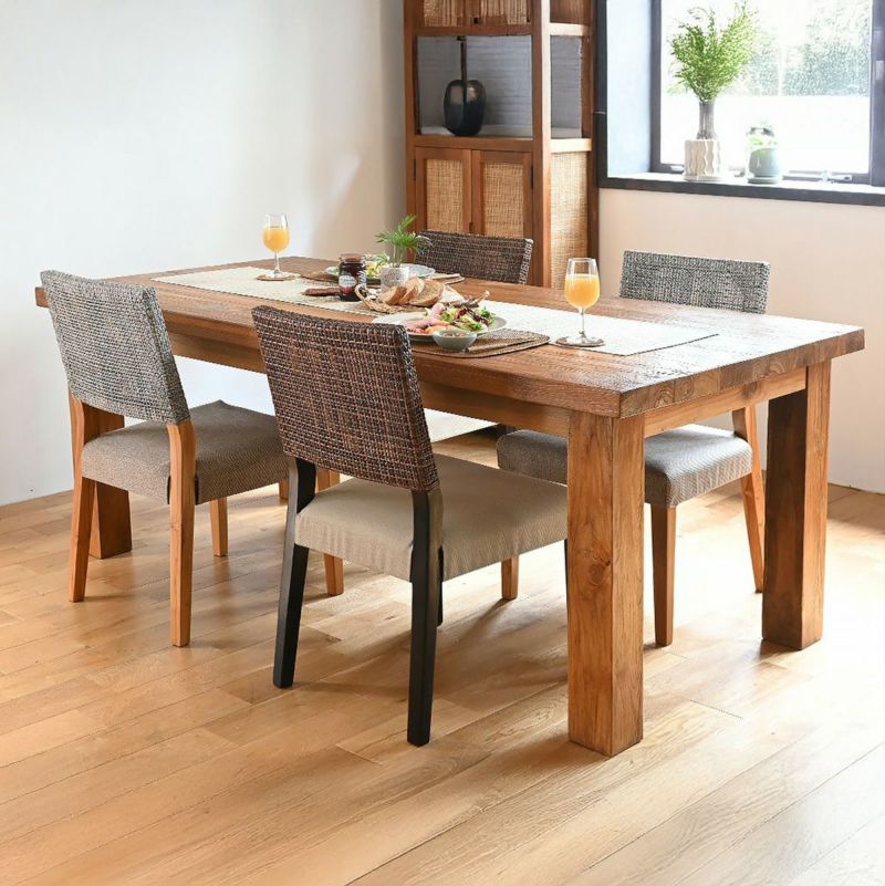 テーブルは重厚感のあるオールドチークの無垢材を贅沢に使用。厚みのある天板とシンプルな4本脚デザインは、流行に左右されず長く使えるベーシックスタイルです。 天然木ならではの豊かな表情は、使い込むほどに味わいを増し、家族の時間とともに深まっていきます。
