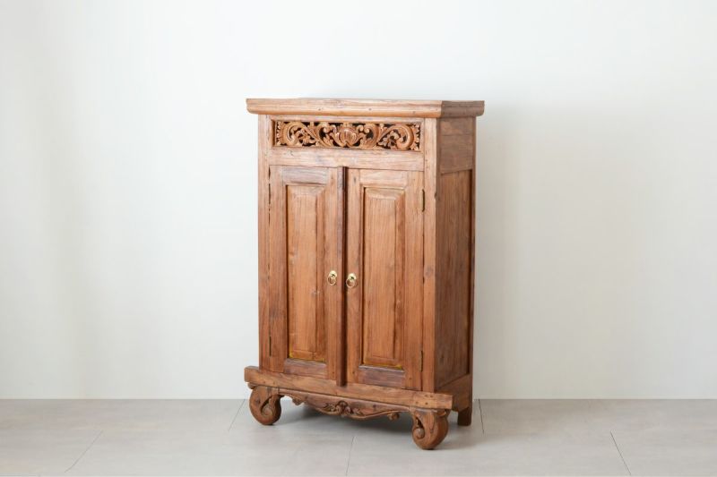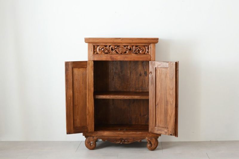 リビングボードとして本棚や飾り棚におすすめです。リビングルームでひときわ目立つ存在感を放ちます。 美しいレリーフは、華やな印象を与えます。また、風合いのよく出た古材の質感が独特の雰囲気を演出してくれます。