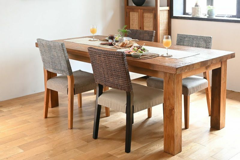 テーブルは重厚感のあるオールドチークの無垢材を贅沢に使用。厚みのある天板とシンプルな4本脚デザインは、流行に左右されず長く使えるベーシックスタイルです。 天然木ならではの豊かな表情は、使い込むほどに味わいを増し、家族の時間とともに深まっていきます。