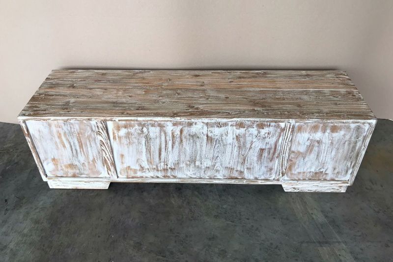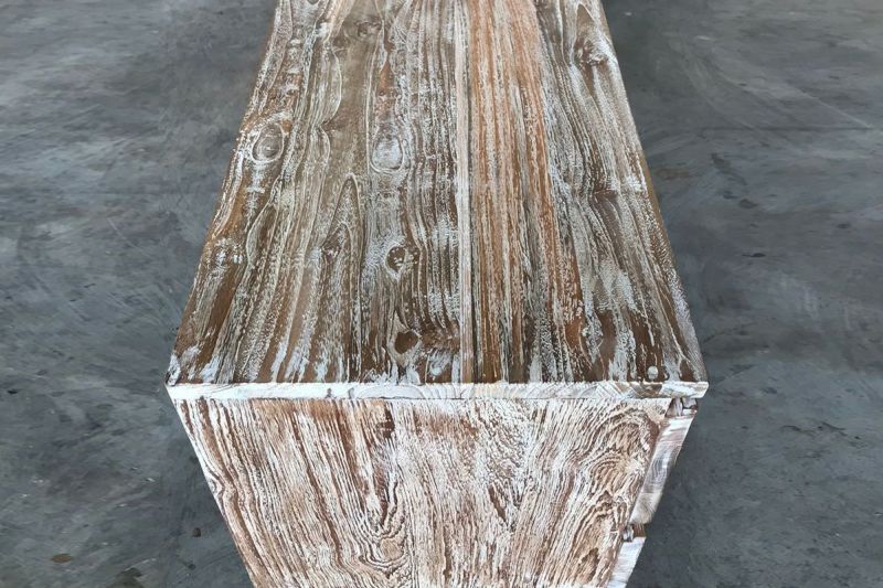 チーク材にホワイトウォッシュ加工を施し、明るく爽やかな色合いを出しています。海辺のインテリアや、サーフスタイルによく合う風合いです。
