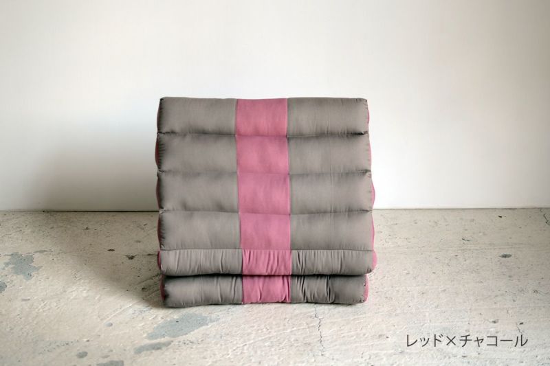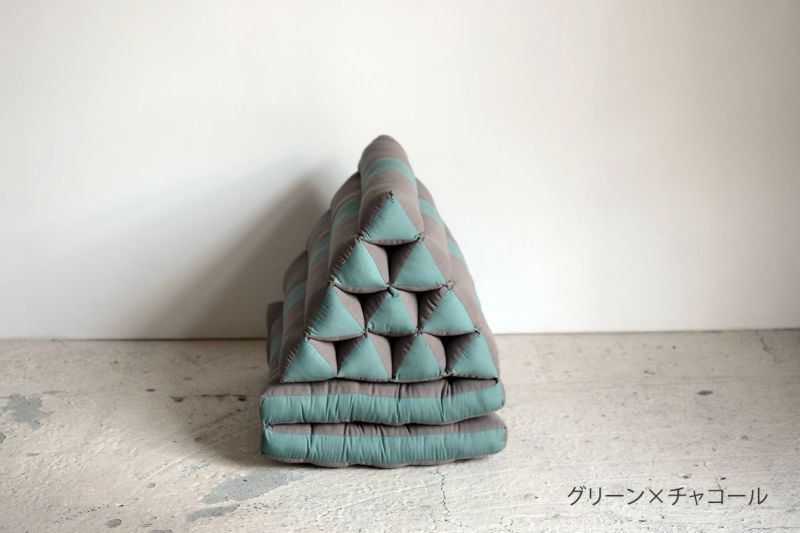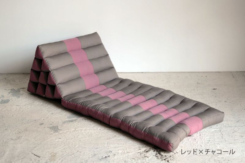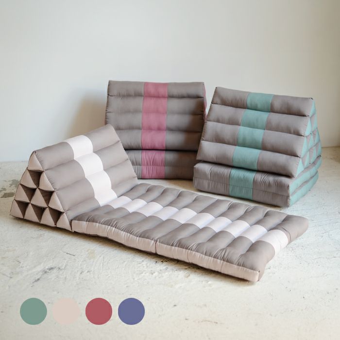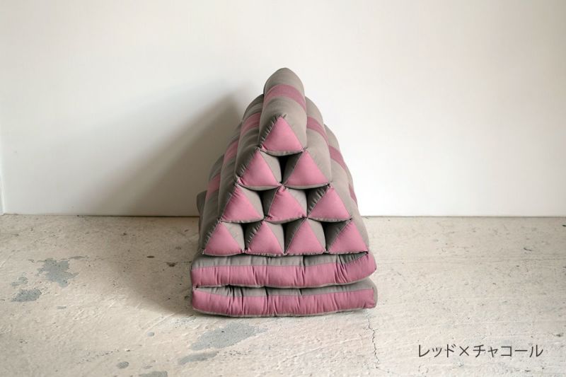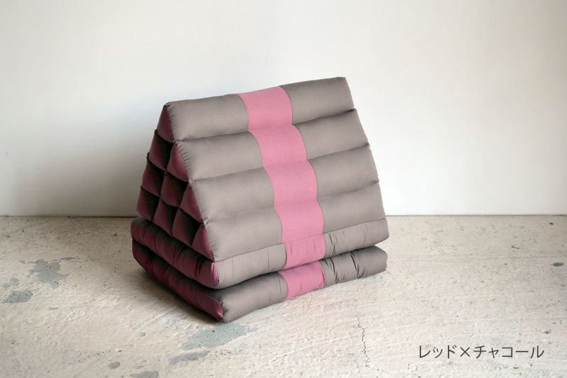 タイのアジアンリゾートでよく見られるクッションなので、タイクッションとも呼ばれます。枕とクッションを一緒にしたようなそのデザインは、体を休めるのに最適なデザインです。三角部分を背もたれにして、ゆったりと自由な体勢でくつろぐのが基本。三角部分に肘をついて、座ることもできます。また、シート部分が折り畳めるので、折り畳んだ状態でソファのオットマン代わりに足を乗せるもよし。使わないときは畳んでおけるのも便利なところ。リビングに広げて体を預ければ、ついウトウトしてしまいそうです。