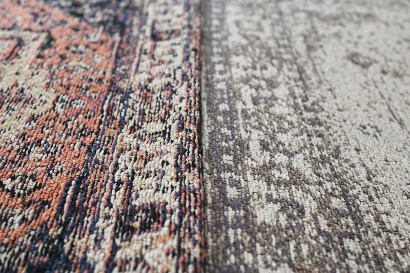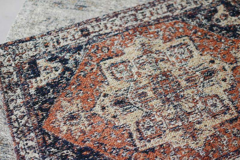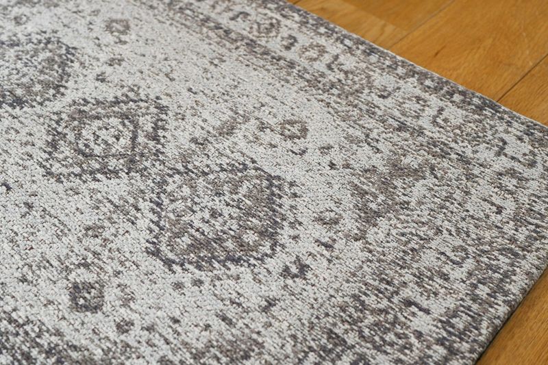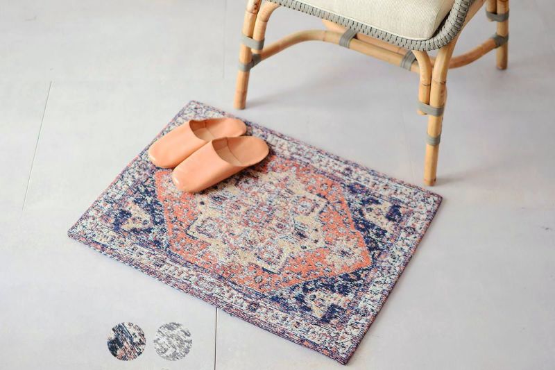 ジャガード織りでヴィンテージのような掠れた柄や不均一な色を表現したマットです。 毛足の短いシェニール糸で遊び毛が出にくく、肌触りの良い一枚。裏地付きでしっかりとした厚み。玄関サイズながら重厚感のあるラグマットです。