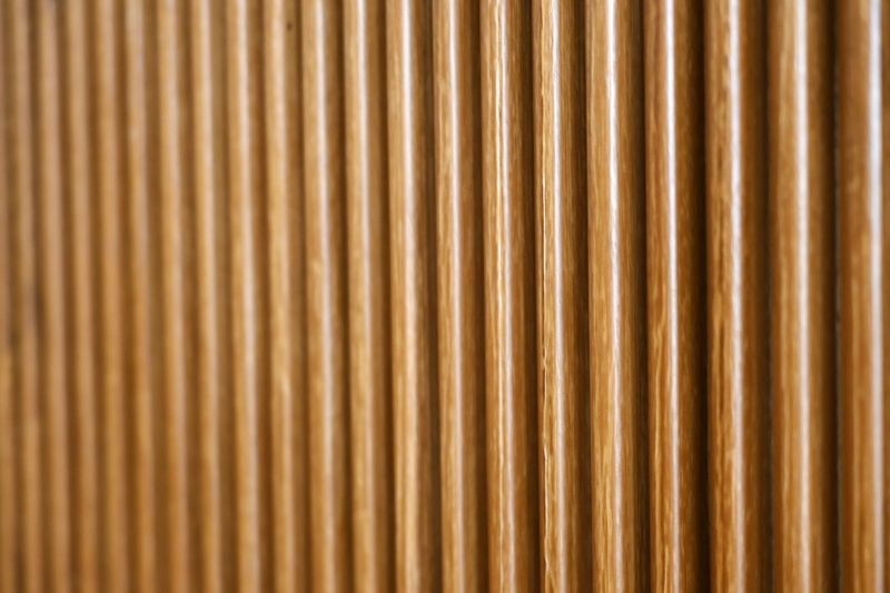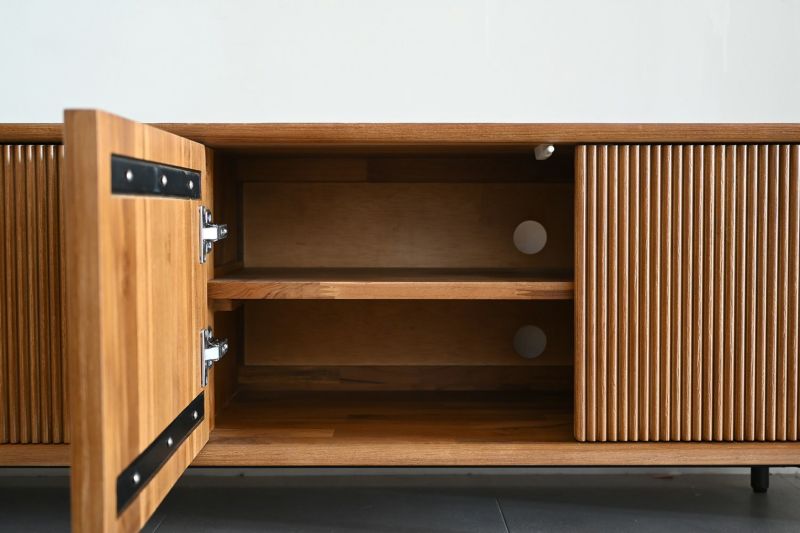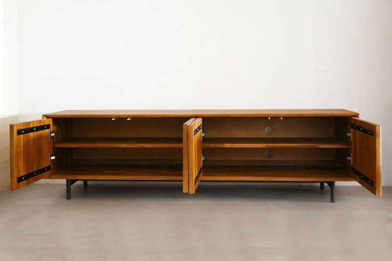 ルーバーデザインのすっきりとしたローボード。チーク材を使用し温もりある天然木の雰囲気はそのままに、直線ラインが並ぶスタイリッシュなデザインです。モダンなインテリアとも相性よく、優美な印象を与えます。脚は黒いスチール製。チーク材の素材感を引き立てます。