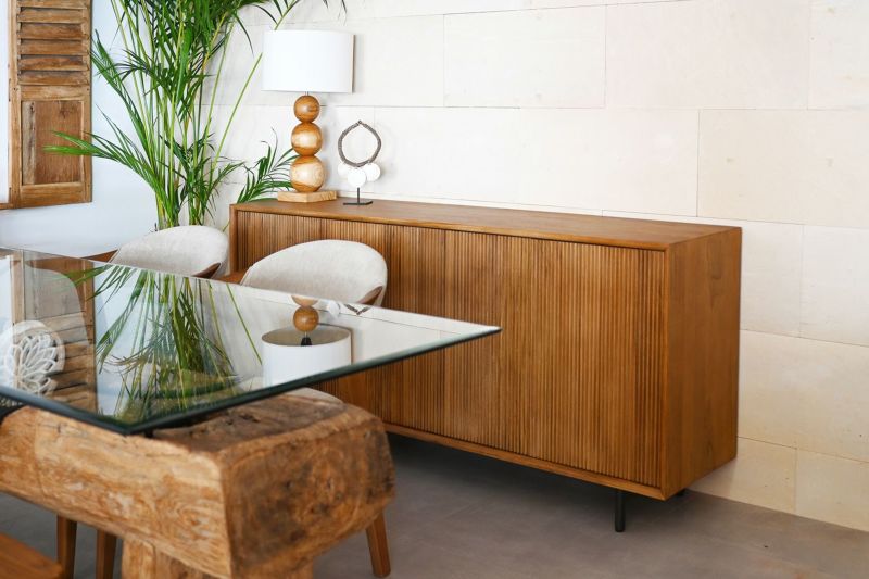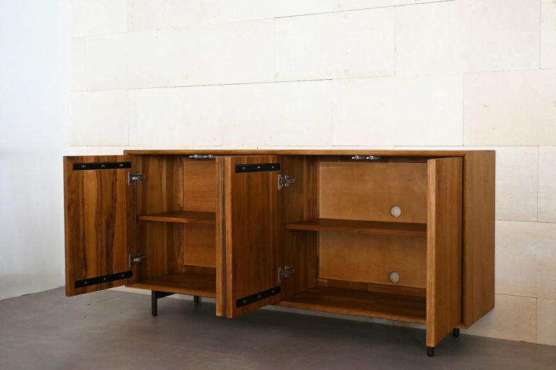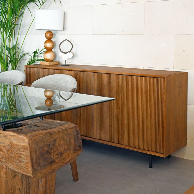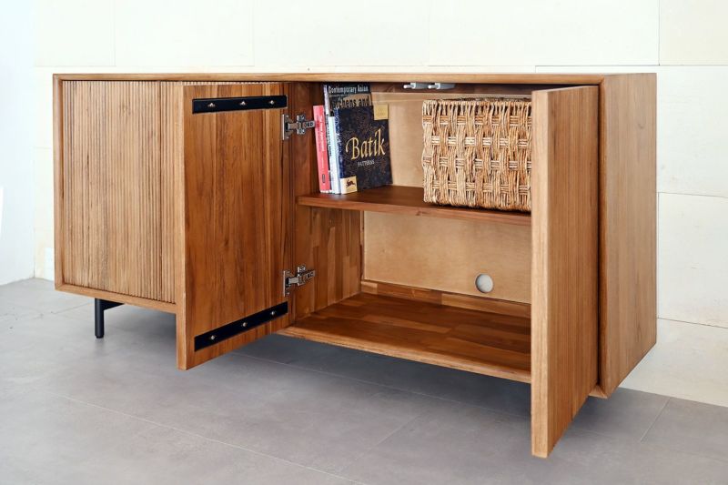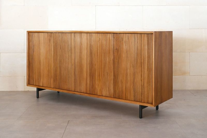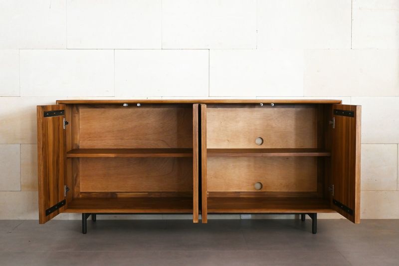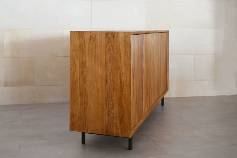 ルーバーデザインのすっきりとしたキャビネットです。チーク材を使用し温もりある天然木の雰囲気はそのままに、直線ラインが並ぶスタイリッシュなデザインです。モダンなインテリアにも相性よく、優美な印象を与えます。脚は黒いスチール製。チーク材の素材感を引き立てます。