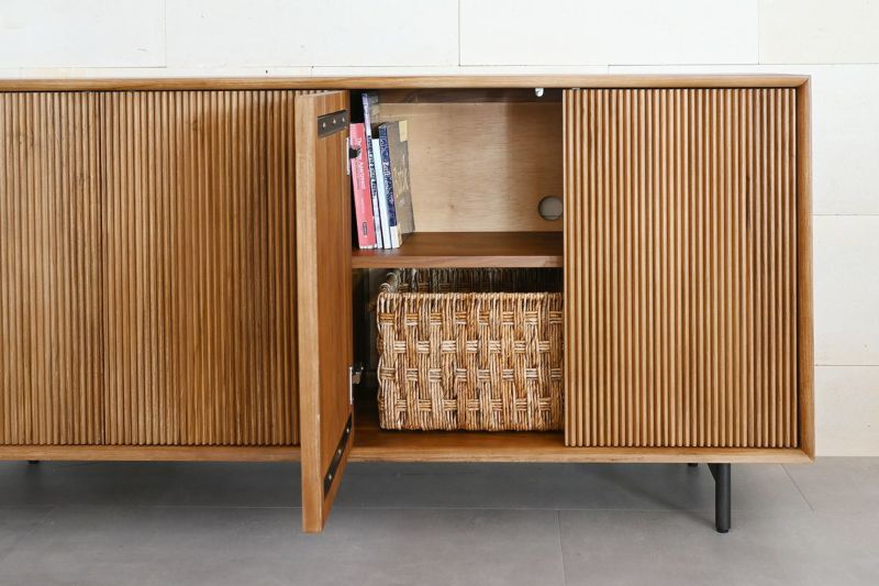 4枚の扉収納を備えています。右側の扉内には配線孔があるのでAV機器の収納にも最適です。リビングルームやダイニングルームを問わず、様々なシーンで活躍します。扉は取っ手や引手いらずのプッシュオープン式。スマートな外観そのままに開閉が可能です。