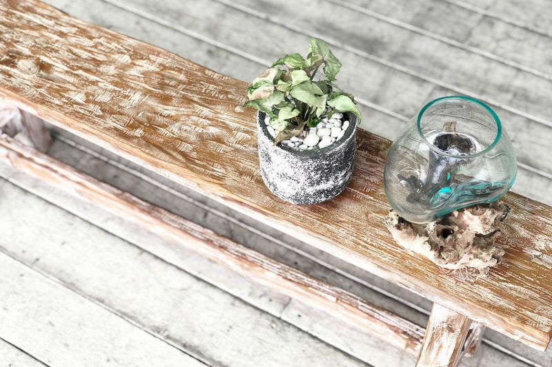 チーク材にホワイトウォッシュ加工を施し、明るく爽やかな色合いを出しています。海辺のインテリアや、サーフスタイルによく合う風合いです。背もたれのないベンチはお部屋の印象をすっきりさせる効果もあり、ダイニングテーブルに合わせるのもおすすめです。