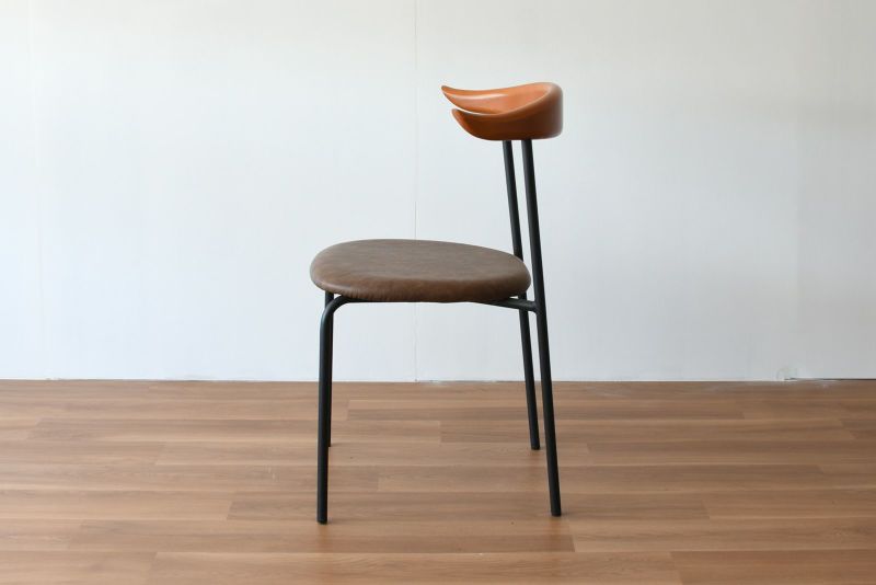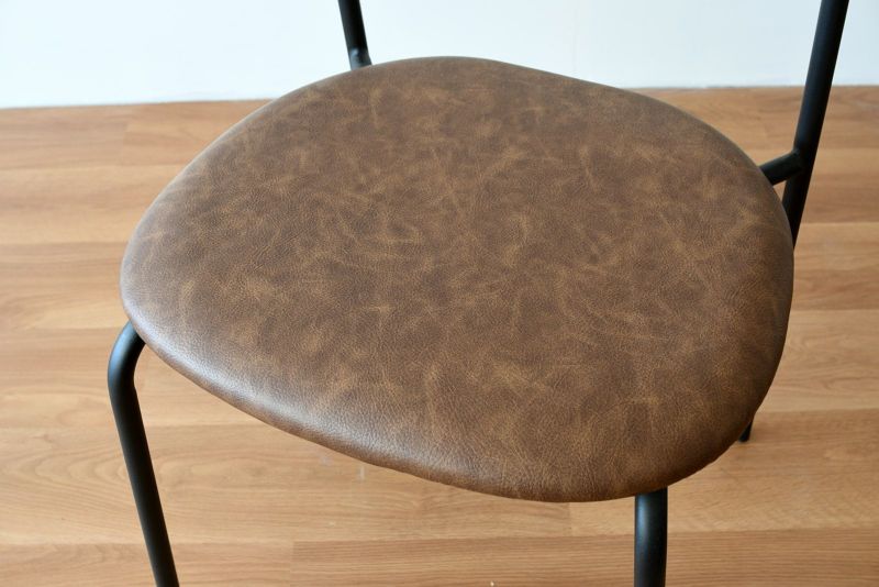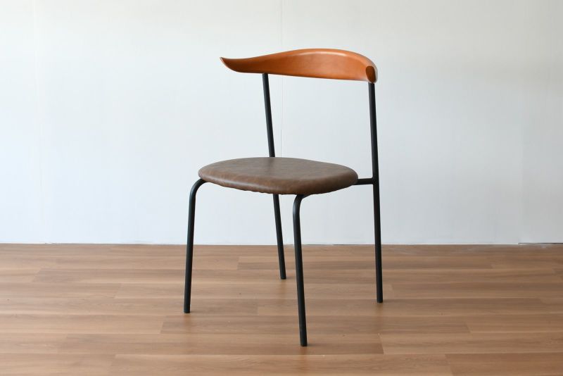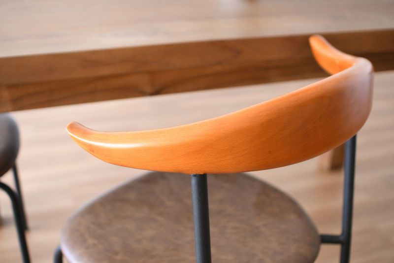 背もたれに丸みをつけた座りやすいデザインのチェアです。脚はスチール材を使用することによって細いラインながら丈夫さと安定感をキープ。座面はソフトレザーを使用。適度なクッション性のある座り心地です。ナチュラルな木の印象は残しつつ、インダストリアルの重厚感もプラスされたバランスの良いチェアです。