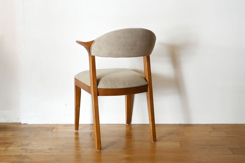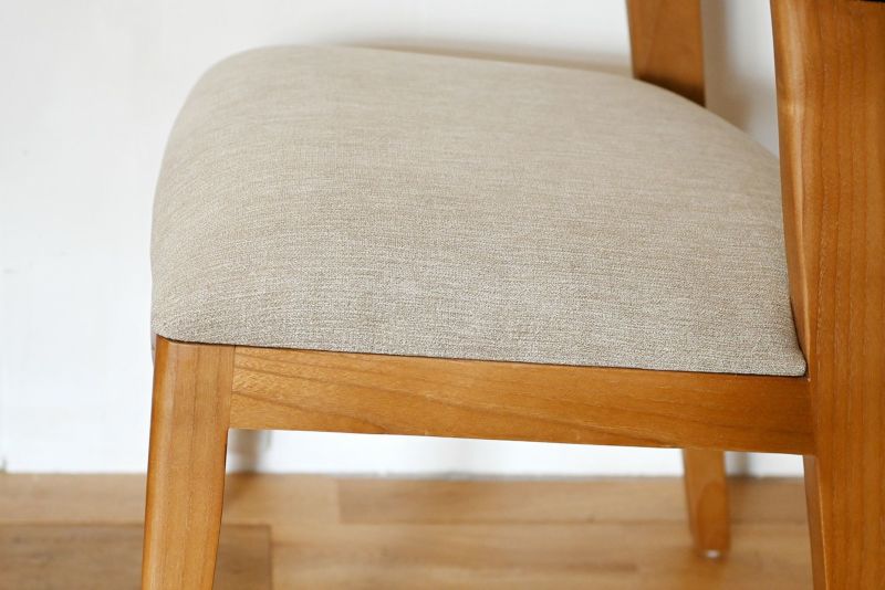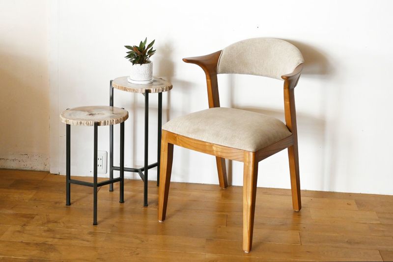 通常のアームチェアより短めのアームを持たせたセミアームチェア。短めのアームはダイニングテーブルに合わせやすい上、肘掛けがあることで、よりゆったりと座ることができます。アームチェアに比べて、出入りのしやすさもあり、見た目もすっきりと圧迫感を抑えられます。ナチュラルなカラーの組み合わせが素朴でやさしい雰囲気を作り上げ、緩やかなカーブがしっかりと背中を受け止めてくれます。