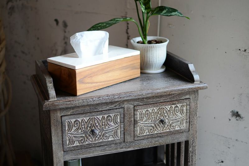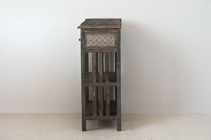 繊細なレリーフが特徴的なMUSCA(ムスカ)シリーズからスモールコンソールが登場しました。前面に美しいレリーフが施され、グレイウォッシュ仕上げによりチーク材の木目が際立つ、味わい深いデザインを実現しています。コンパクト感に加え、すっきりとした印象で、圧迫感を感じさせない仕上がりになっています。