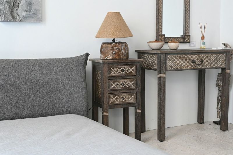 とにかく目を引くのが、七宝柄のレリーフが引き出しと両サイドに施されたデザインです。これはインドネシアの職人がひとつひとつ均一に彫り上げる手仕事の技。硬いチーク材をここまで精巧な柄に彫ることができる職人は非常に希少です。 七宝は、耐えることのない永遠の連鎖と拡大を意味し、円満、調和の意味が含まれています。この七宝柄の彫りがあるだけで、オリジナリティがぐっと高まり、こだわりを感じさせるアイテムに。