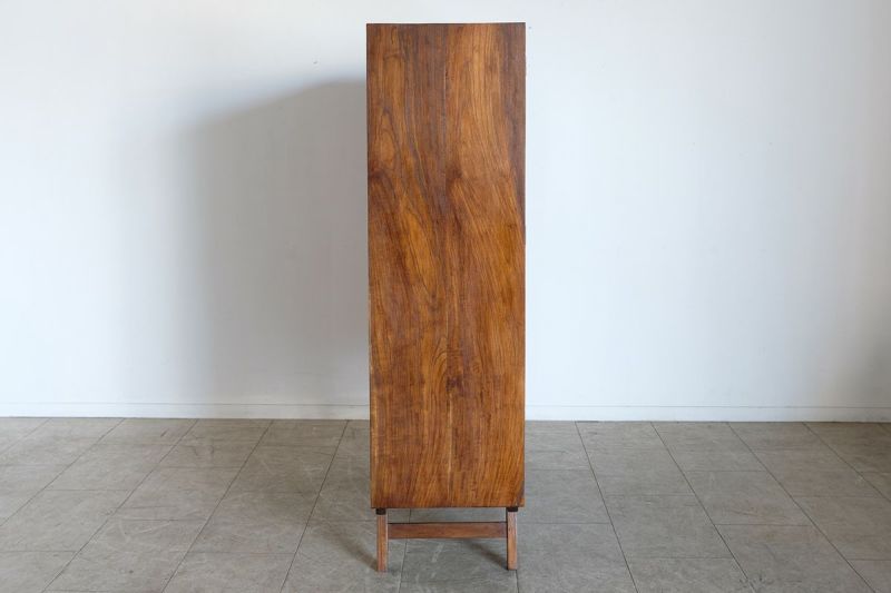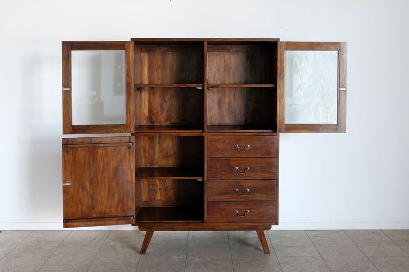 キッチン収納に最適なキャビネットです。扉収納の中はそれぞれ2段にわかれているため、使いやすさがあります。4段の引き出し収納もあり、アシンメトリーなデザインが空間にリズムを作ります。左下に入ったレリーフがアクセントになり、ほどよい存在感を与えています。