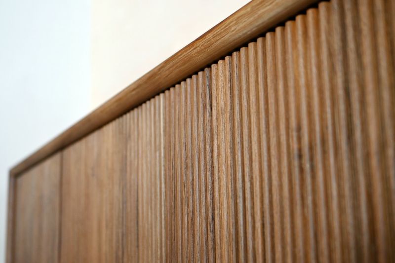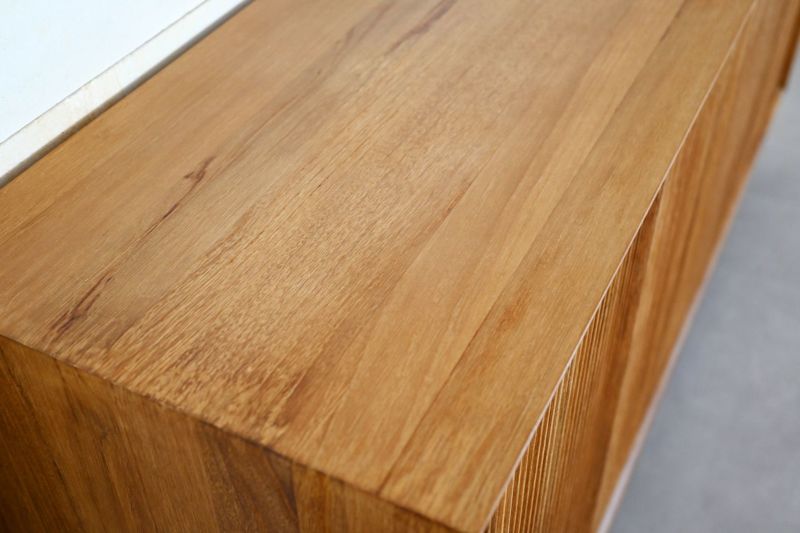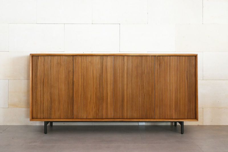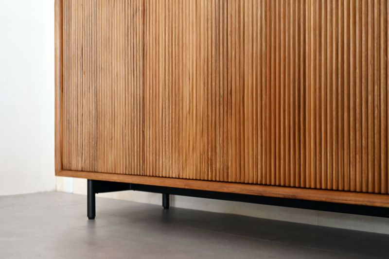 ルーバーデザインのすっきりとしたキャビネットです。チーク材を使用し温もりある天然木の雰囲気はそのままに、直線ラインが並ぶスタイリッシュなデザインです。モダンなインテリアにも相性よく、優美な印象を与えます。脚は黒いスチール製。チーク材の素材感を引き立てます。