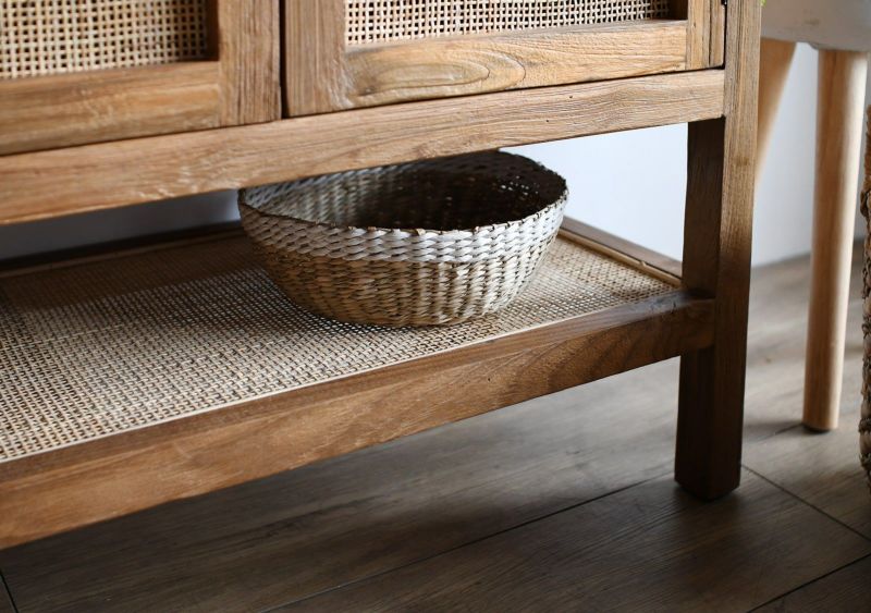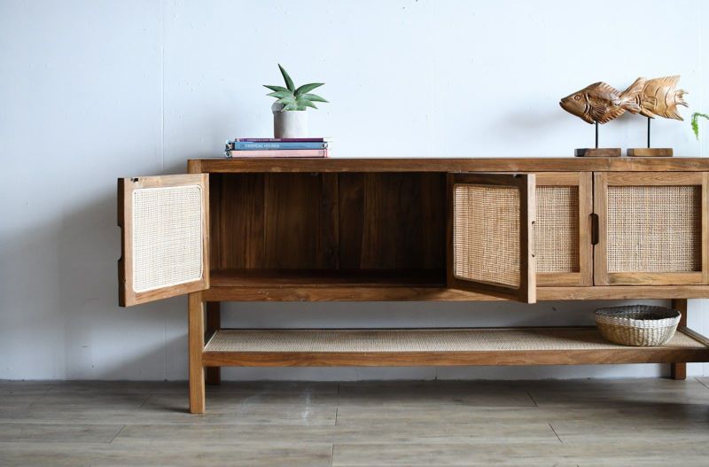職人の手によりしっかりと作られるサイドボード。上部はラタンをあしらった扉収納。下部のオープンスペースは、本や雑貨を飾ったり、収納ボックスを加えて収納力をアップしたりとアレンジが楽しめます。自然素材のもつ優しさとあたたかみのある雰囲気が魅力的。ラタンは数十年の耐久性があり、強さとしなやかな柔軟性を兼ね備え、とても軽く、家具の素材として最高の特徴を持った素材です。さらに使うほどに表面が深みのあるアメ色に変化して、独特の美しさを醸し出すのも特徴のひとつ。職人の確かな技術と丁寧な仕事によって生まれる細かく編みこまれたラタンの扉は、ナチュラルで華やかなアクセントになります。