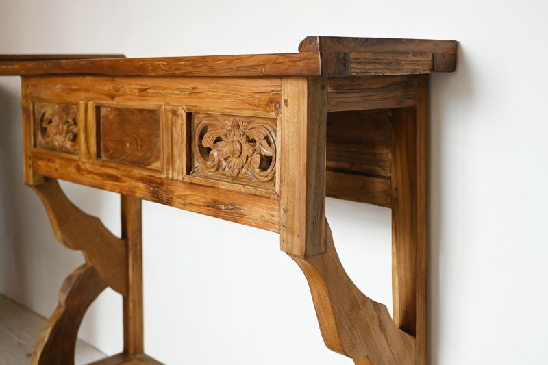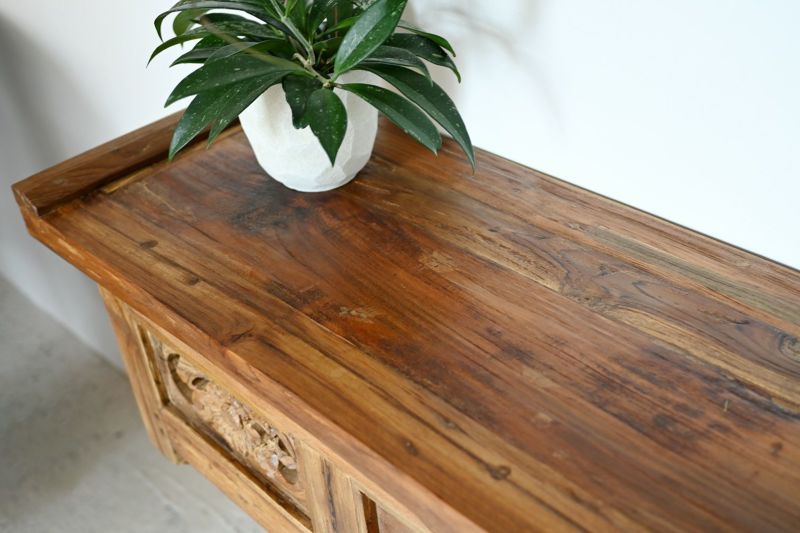 古材の雰囲気を活かして製作されたインドネシアのコンソールテーブル。前面に施されたレリーフが他にはないオリジナリティを感じさせます。 脚のデザインにもユニークさがあり、個性の光るコンソールテーブルです。飾り棚としてランプやオブジェを置いて空間演出をするのに向いています。エントランスやリビングルームにおすすめです。