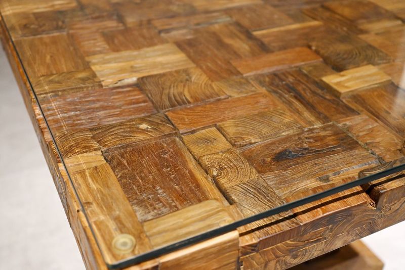 ウッドピースの天板は、互い違いに組み合わせ、あえて凹凸を残した仕上がりです。ガラスを載せることで日常使いしやすく、ウッドピースのひとつひとつが光を受けて様々な表情を見せてくれます。天板の厚みはガラスを入れて約9cm。天板からは、素材のあたたかみが感じられる古材の風合いがダイレクトに感じられます。