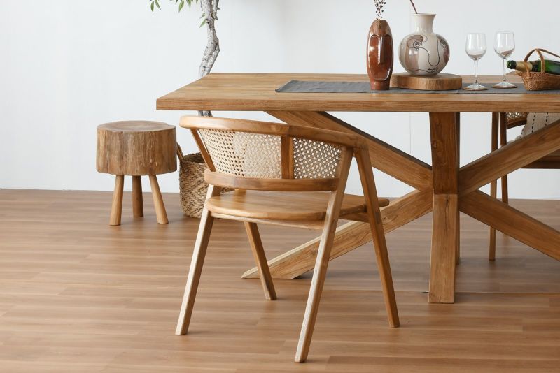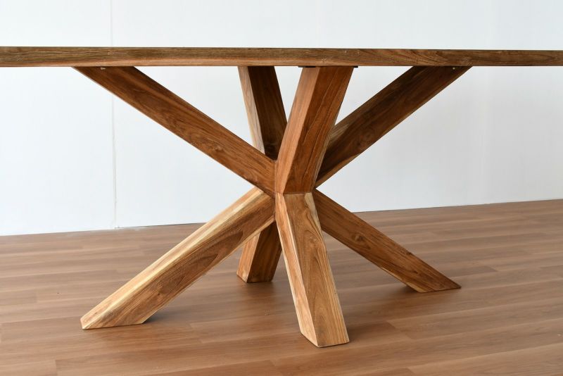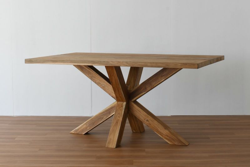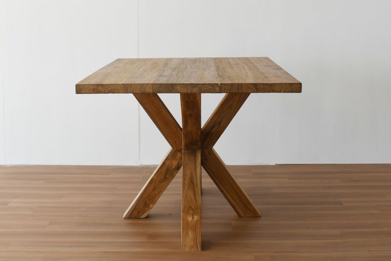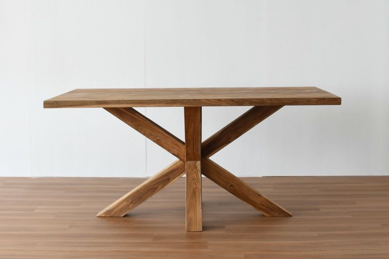天然木を使いながらクロスさせた脚のデザインがスタイリッシュな印象を持たせるダイニングテーブルです。 無垢のチーク材なので木目や節の表情は1台づつ異なり、使い込むたびに変わる自然の味わいを楽しむことができます。チーク材のナチュラルカラーは開放感のある明るいダイニングシーンを演出します。無垢材の厚板を使用した脚の存在感は抜群で、直線の作るシャープなフォルムがナチュラルからモダンまで幅広いスタイルにマッチします。