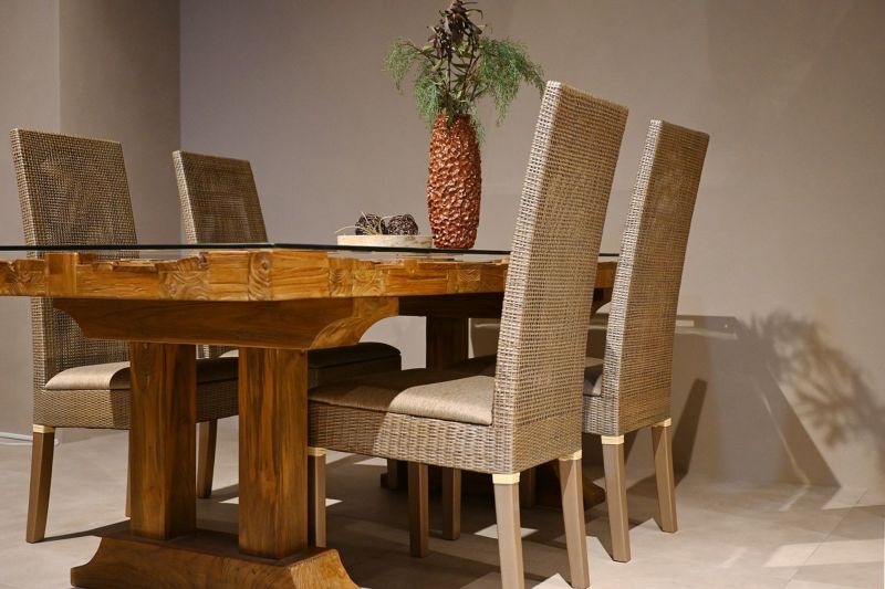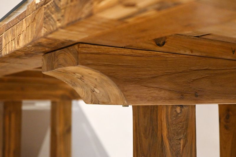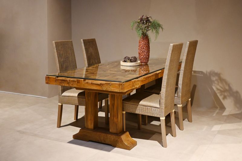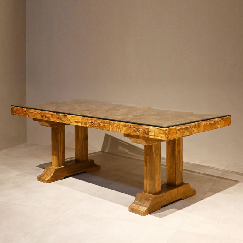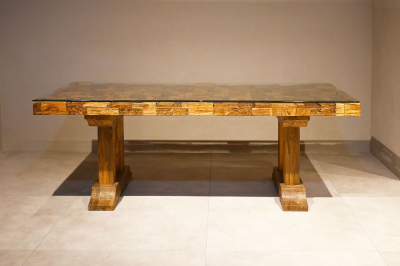 上質なチーク古材の木片をランダムに並べた土台にガラス天板を組み合わせたデザイン性のあるダイニングテーブルです。200cmの古材とガラスの天板を支える脚は安定感ある2本脚タイプ。脚のデザインにボリュームがありますが、目を引く天板のウッドピースによって、重厚感が分散されるため、そこまで重い印象を与えません。