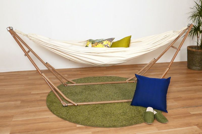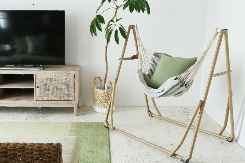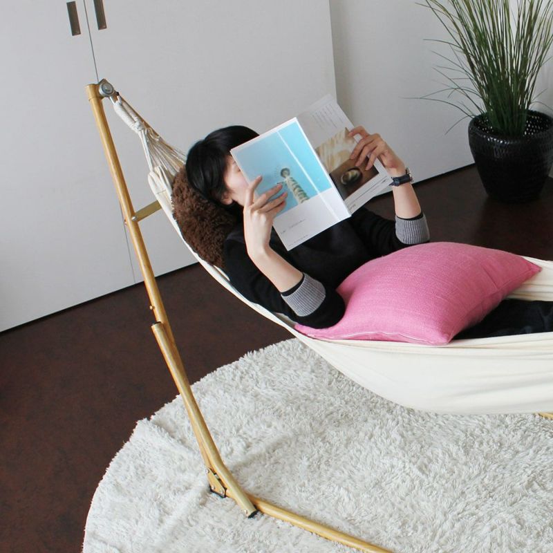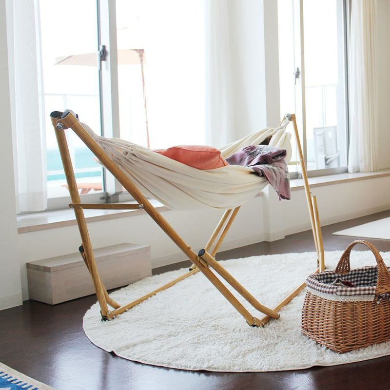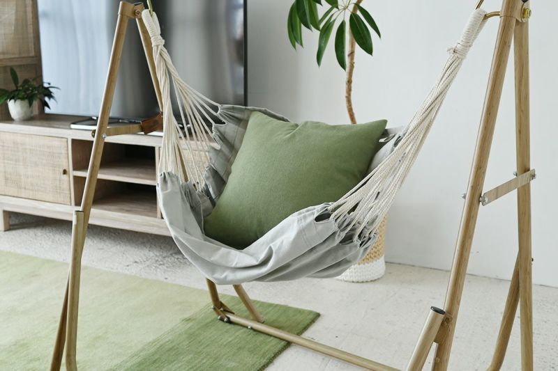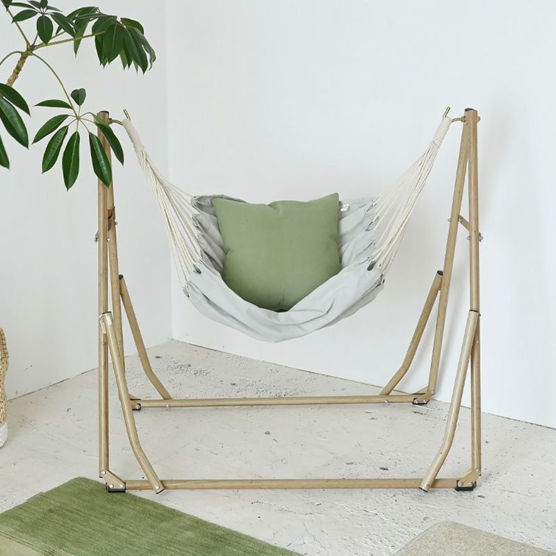 やさしい質感の美しい木目調スタンド。お部屋の家具になじみやすく、木目ならではのぬくもりを空間にお届けします。ハンモック用の生地もチェア用の生地も、優しい色合いなのでお部屋を選びません。インテリアとしても、絵になるおしゃれなハンモックです。