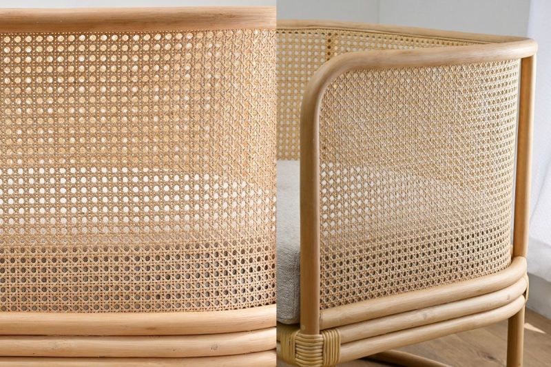 ピールと呼ばれるラタン表皮を細く挽き、それをタテ、ヨコ、ナナメに編んだ「カゴメ編み」。 シート状にしたカゴメ編みをフレームに挟み込むのではなく、あえて埋め込むことで、編み目がしっかりと固定され、たわみや歪みを防ぐことができました。 細部にまでこだわった手仕事が、機能性とデザインのバランスを絶妙に実現しています。