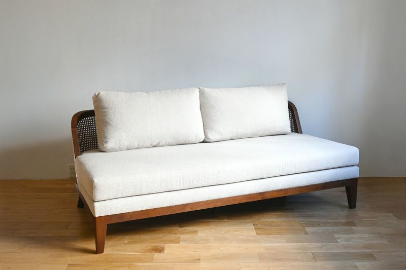 チーク材の温もりとラタンの風合いが絶妙にマッチし、まるで高級リゾートホテルのラウンジにいるかのような雰囲気を演出する3人掛けソファ。座面には厚みのあるクッションを採用し、長期間座っても快適な座り心地を実現してくれる寛ぎのソファです。