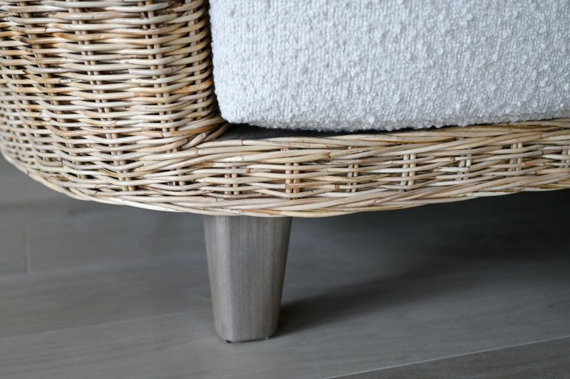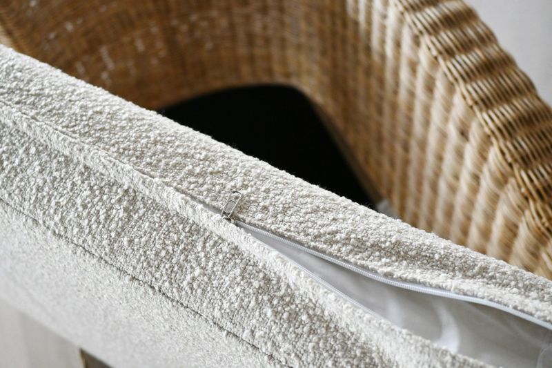 ニュートラルな色合いのラタンはお部屋に馴染みやすく、お部屋に適度な明るさをプラスしてくれます。座面の白いファブリックはブークレ素材。少し立体感のあるモコモコした柔らかい肌触りです。カバーは取り外し可能なので、洗濯も可能です。