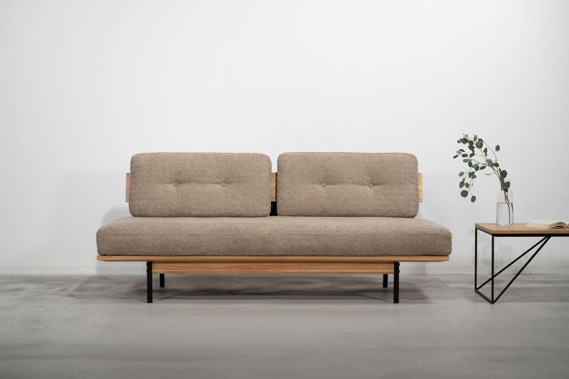 天然木×アイアンのフレームに背面クッションを立て掛ける、すこし個性的なフォルムのソファ。 アームレスですっきりとした印象を与え、高さを抑えた設計なので空間に圧迫感が生まれません。 ファブリックは人気のブークレ生地を使用しています。