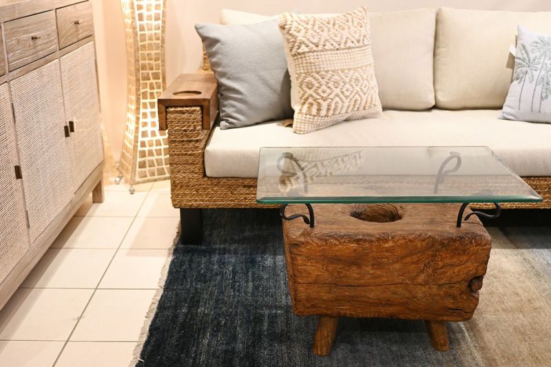 古木の土台にあいた丸い穴は自由自在にアレンジできます。この独特の形をいかしてインテリア小物をディスプレイをすれば、季節感やオリジナリティを出すことができます。ガラスの下に飾るものによって様々な表情を見せる飽きのこないテーブルです。 造花や、お気に入りのファブリック、洋書など、好きなものを飾って、自分だけの心地よいインテリア空間をお楽しみください。
