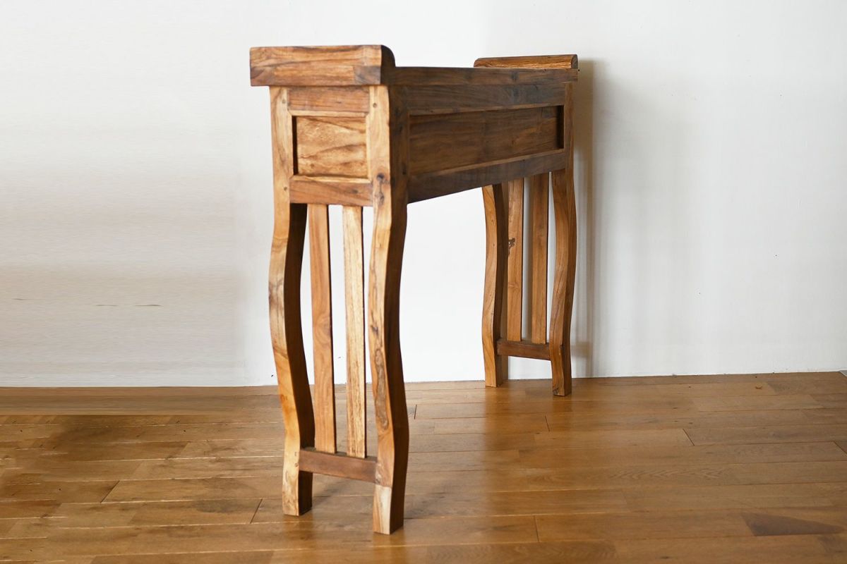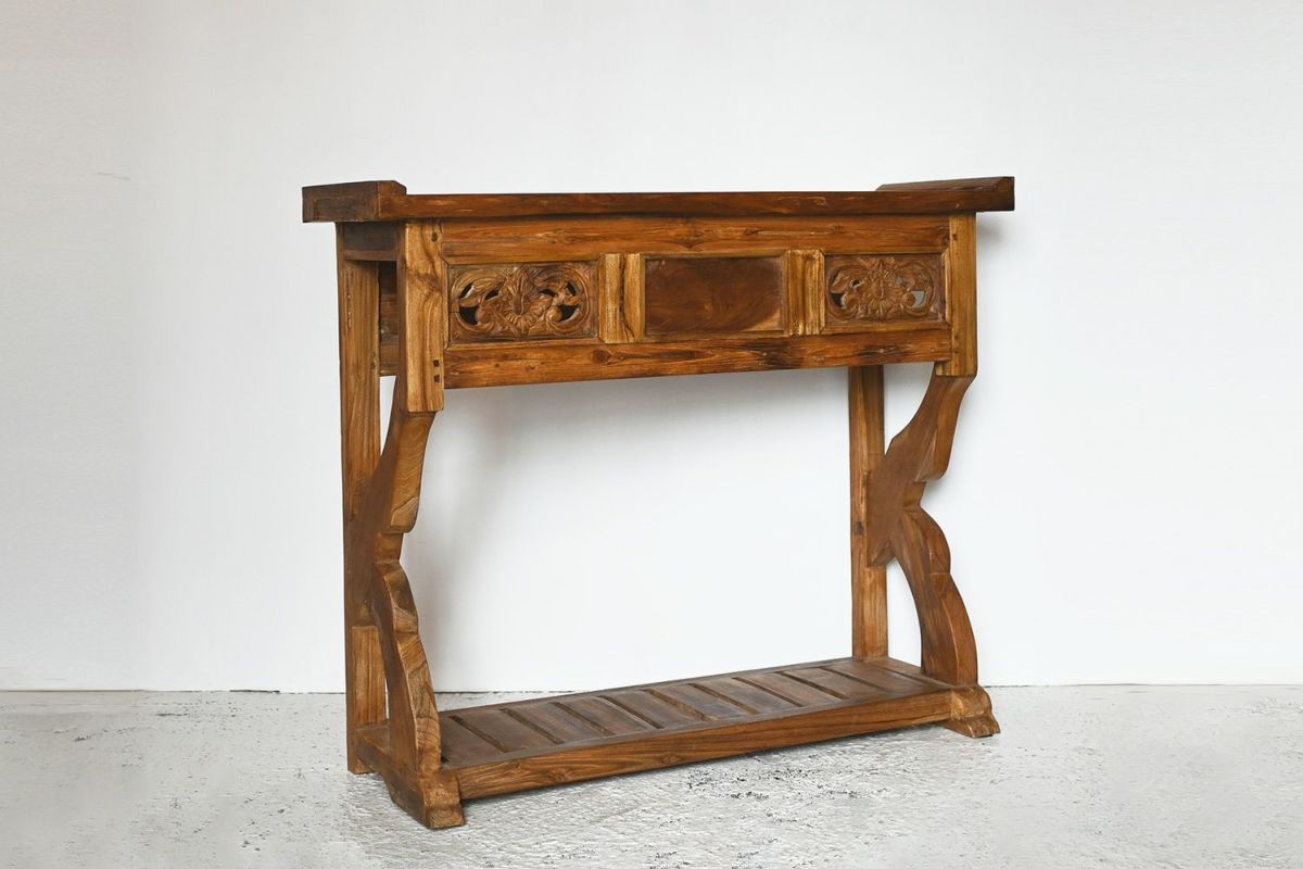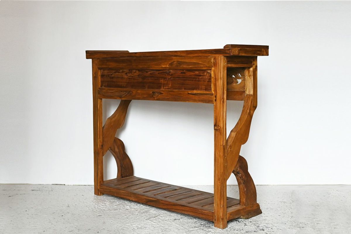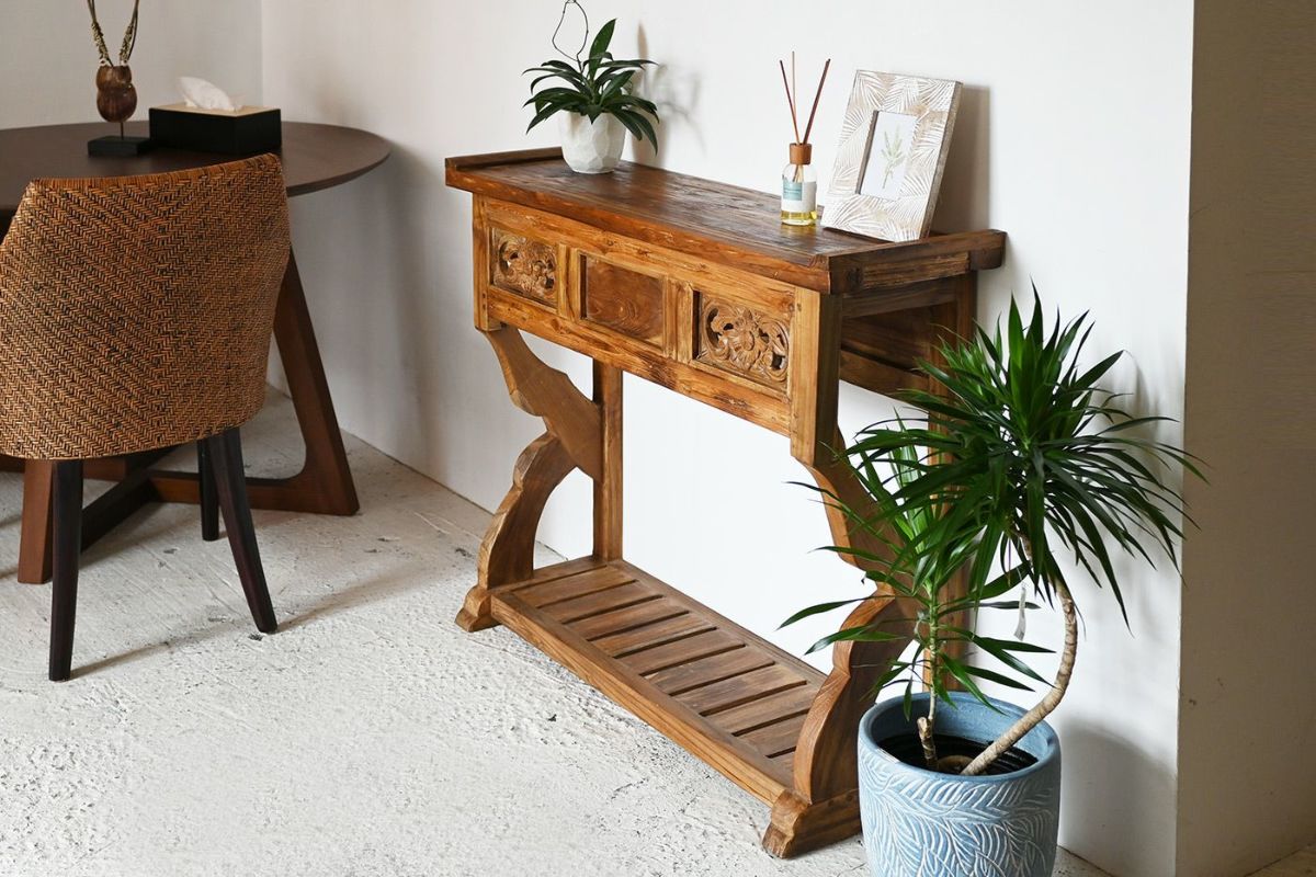 - 壁面の装飾や飾り棚に用いられるコンソールテーブルです。高さのあるテーブルなので、デスクとしてパソコンを置いたり、化粧台にしたり、様々なシーンに取り入れられます。古材を使った風合いのあるコンソールテーブルは、インテリアの雰囲気作りにも役立ちます。細かなレリーフ装飾などこだわりのデザインを備えています。