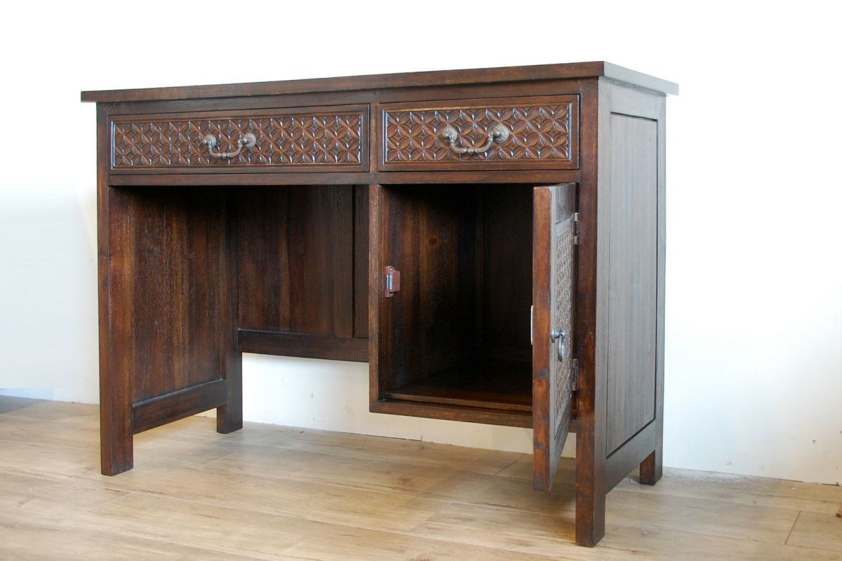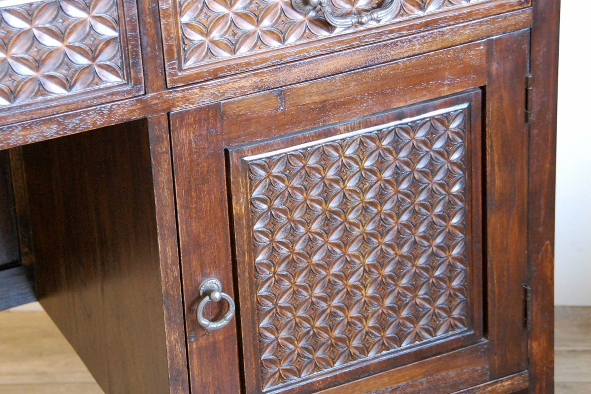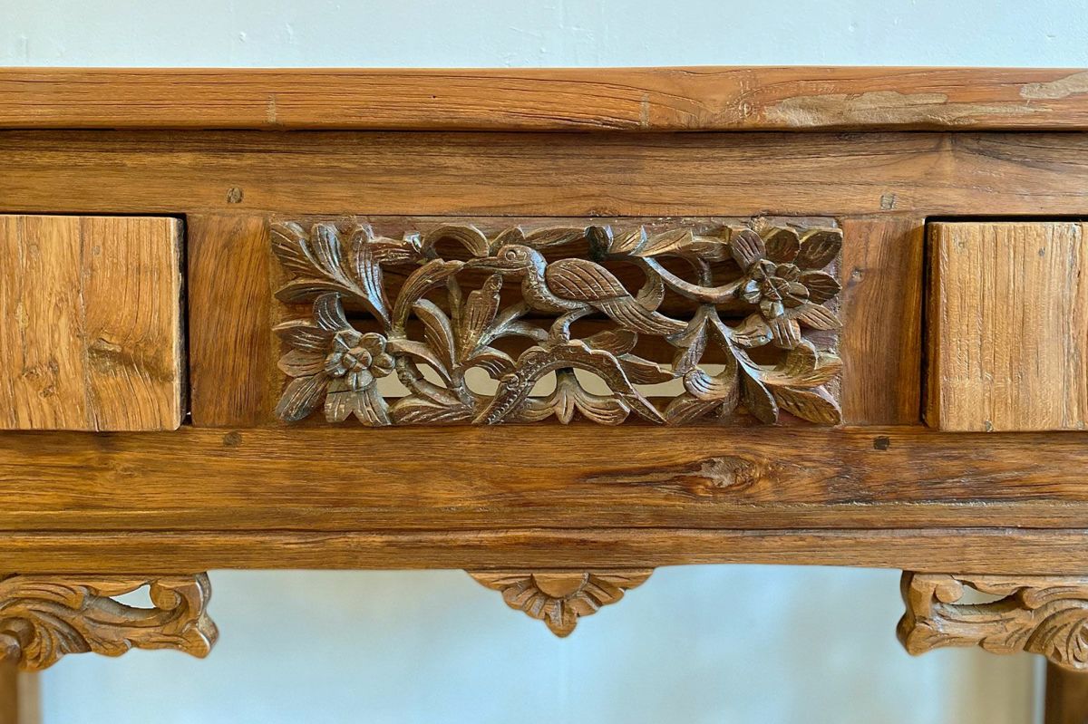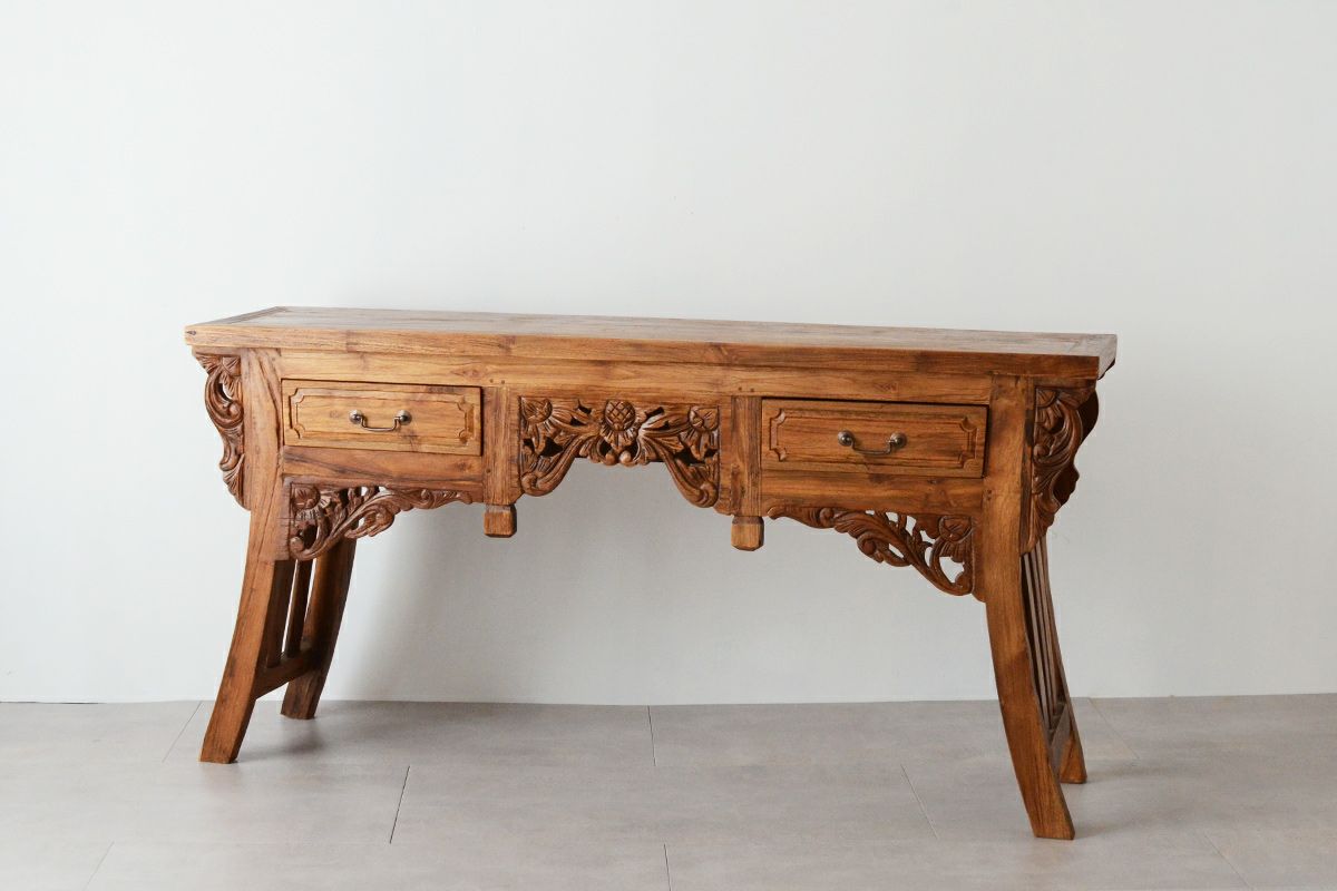 - 壁面の装飾や飾り棚に用いられるコンソールテーブルです。高さのあるテーブルなので、デスクとしてパソコンを置いたり、化粧台にしたり、様々なシーンに取り入れられます。古材を使った風合いのあるコンソールテーブルは、インテリアの雰囲気作りにも役立ちます。細かなレリーフ装飾などこだわりのデザインを備えています。