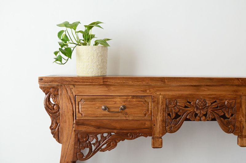 古材の雰囲気を活かしてリプロダクトされたコンソールテーブルです。風合いのあるレリーフが魅力的で他にはないオリジナリティがあります。古材ならではの独特の質感がよく出ていて、お部屋の中で印象的なシーンを演出してくれます。飾り棚として、ランプやオブジェを置いて空間演出にするのもよし。エントランスや待合室に置くのもおすすめです。お部屋の中では、デスクは必要ないけどちょっとした作業場がほしいときなど、さっとノートPCを広げて簡易デスクとして使用することも可能です。真ん中のレリーフの左右は引き出しになっています。
