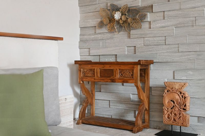古材の雰囲気を活かして製作されたインドネシアのコンソールテーブル。前面に施されたレリーフが他にはないオリジナリティを感じさせます。 脚のデザインにもユニークさがあり、個性の光るコンソールテーブルです。飾り棚としてランプやオブジェを置いて空間演出をするのに向いています。エントランスやリビングルームにおすすめです。