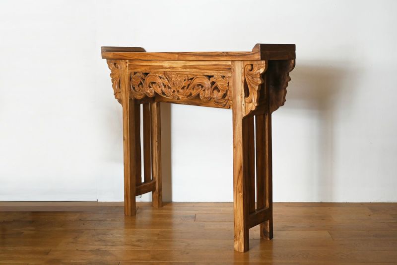 古材の雰囲気を活かして製作されたインドネシアのコンソールテーブルです。前面に施されたレリーフが他にはないオリジナリティを感じさせます。古材ならではの独特の質感がよく出ています。奥行きのないコンパクトなサイズなので、取り入れやすく、飾り棚としてランプやオブジェを置いて空間演出をするのに向いています。エントランスやリビングルームにおすすめです。