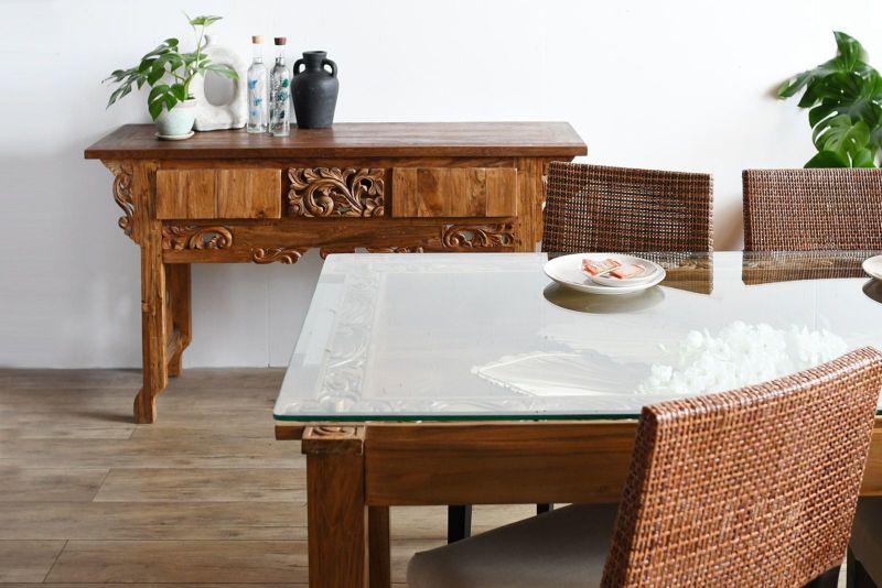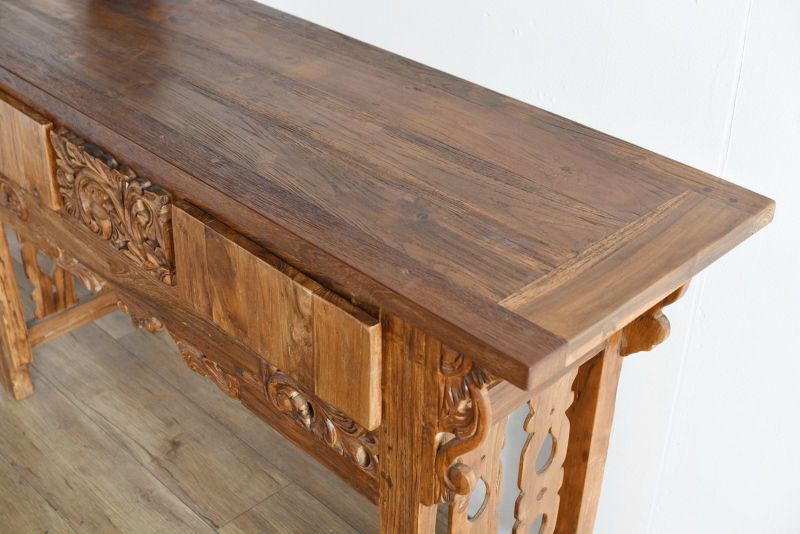 古材の雰囲気を活かしてリプロダクトされたコンソールテーブルです。風合いのあるレリーフが魅力的で他にはないオリジナリティがあります。古材ならではの独特の質感がよく出ていて、お部屋の中で印象的なシーンを演出してくれます。飾り棚として、ランプやオブジェを置いて空間演出にするのもよし。真ん中のレリーフの左右は引き出しになっています。ダイニングルームやリビングルームに取り入れれば、インテリア空間のメリハリにもなります。収納はそこまで必要ないけど空間的に何か置きたいといった場面にもおすすめです。随所に施された職人による手彫りのレリーフが魅力です。