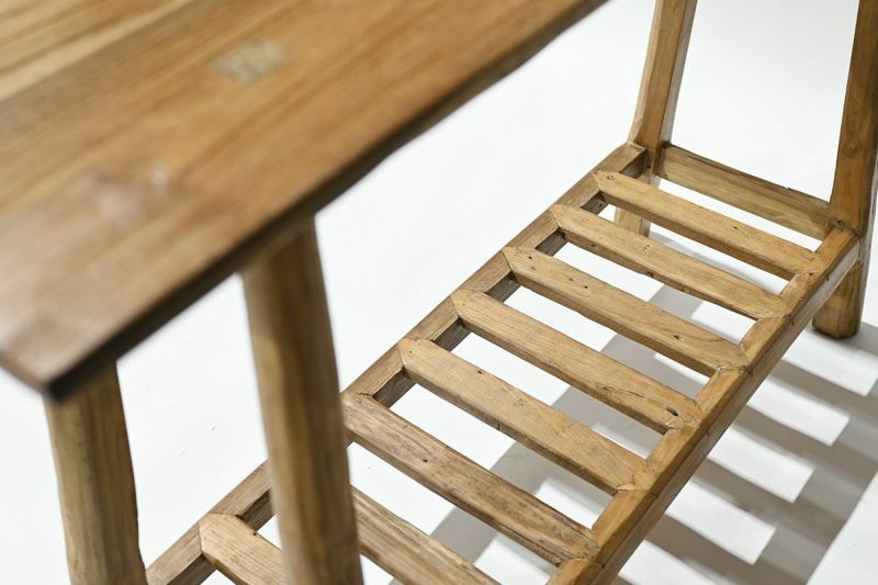 チーク古材が持つ豊かな風合いを活かした、温もり感じるコンソールテーブル。長い年月を経た木ならではの節や色ムラが、ひとつひとつに異なる個性を与えます。傾斜がついた緩やかな脚のライン、ラフなその形状も特徴的。無駄を省いたシンプルなフォルムは、空間にすっきりとした印象を与え、玄関やリビングルームなど、さまざまな場所で活躍します。