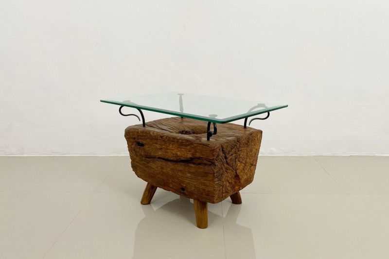 一点ずつ土台の古木の形が異なるテーブルです。ガラスはインドネシアの再生ガラスを使用しています。微かな傷やくすみのある場合もございますが、日常使用に問題ございません。予めご了承ください。