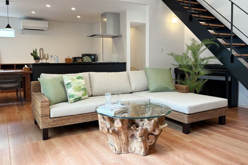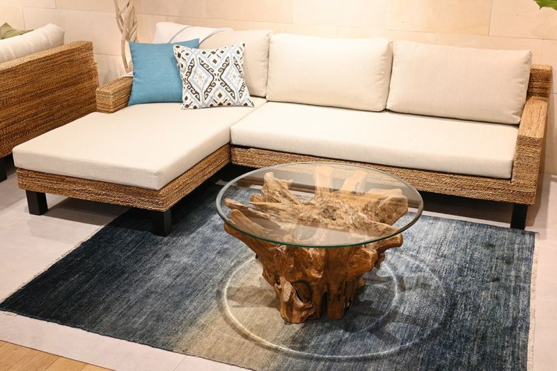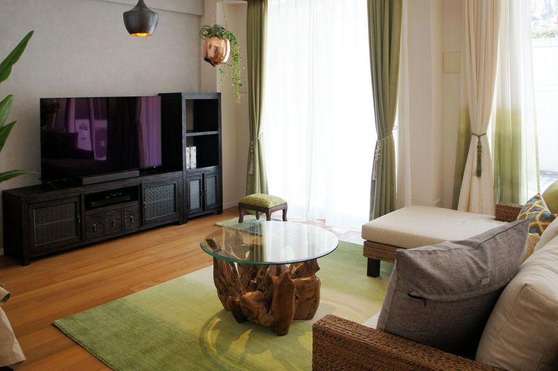 天板がガラス製なので、ソファ前の空間をすっきり広く見せてくれます。ガラス天板は、お茶やコーヒーなどをこぼしても、さっと拭くだけ。アルコールも使えるので衛生面でも安心です。アジアン素材との相性も抜群ですが、スタイルを選ばず自分色のインテリアをお楽しみいただけます。(画像はコーディネート例です。土台は現物と異なります)