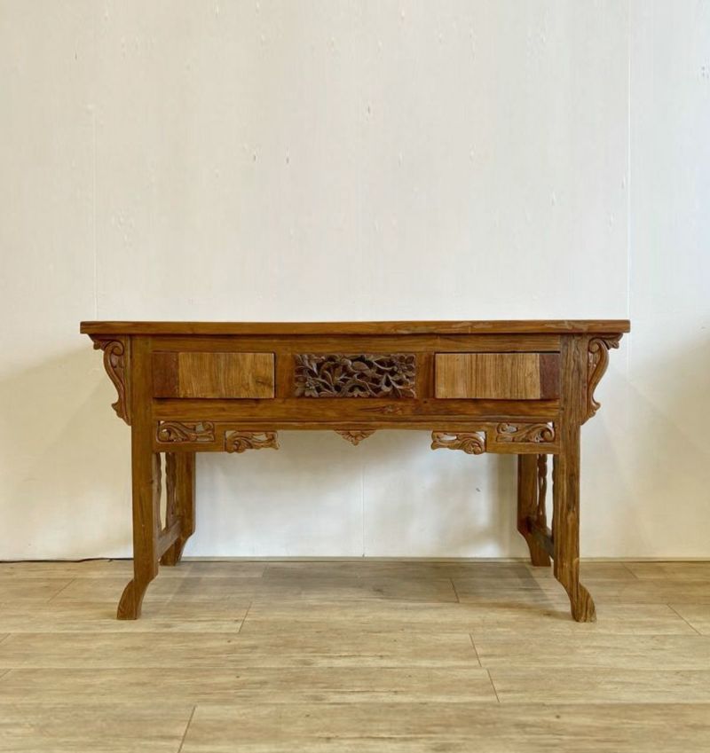 古材の雰囲気を活かしてリプロダクトされたコンソールテーブルです。風合いのあるレリーフが魅力的で他にはないオリジナリティがあります。古材ならではの独特の質感がよく出ていて、お部屋の中で印象的なシーンを演出してくれます。飾り棚として、ランプやオブジェを置いて空間演出にするのもよし。エントランスや待合室に置くのもおすすめです。お部屋の中では、デスクは必要ないけどちょっとした作業場がほしいときなど、さっとノートPCを広げて簡易デスクとして使用することも可能です。真ん中のレリーフの左右は引き出しになっています。