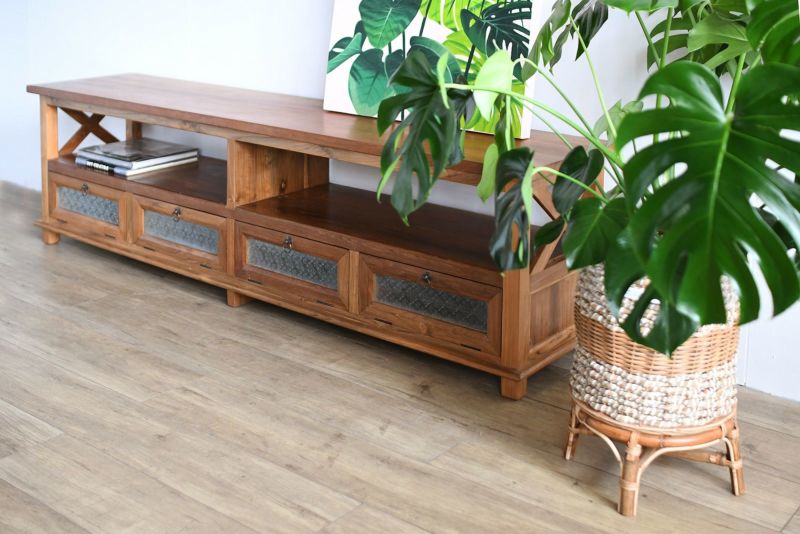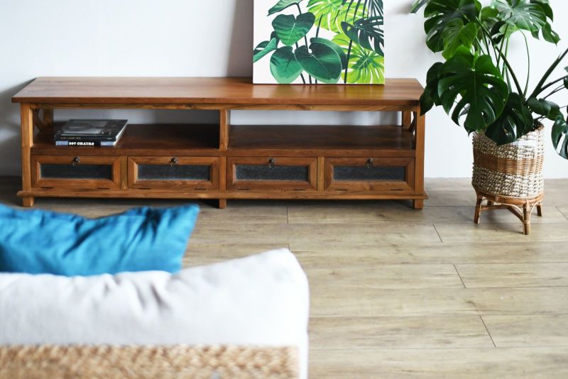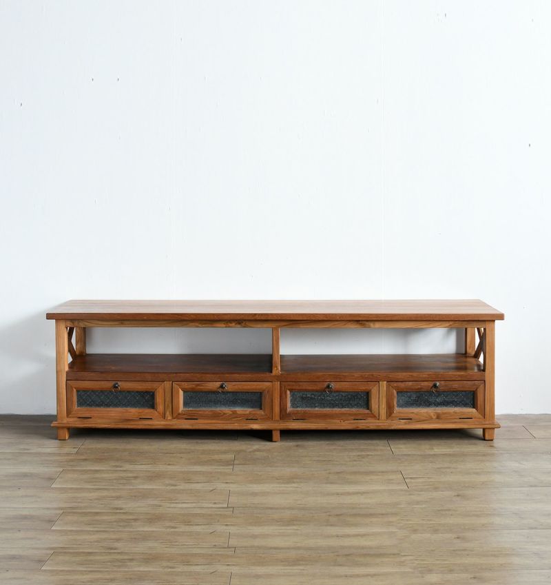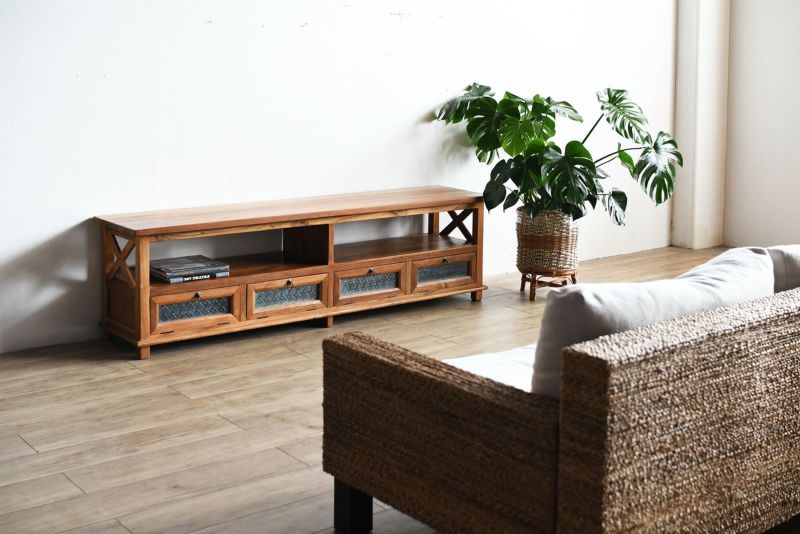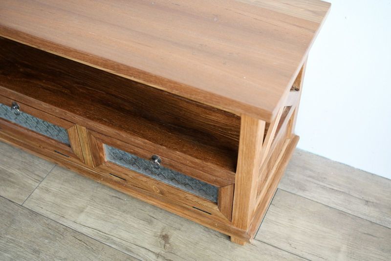 チーク古材とジャワの型押しガラスの組み合せが人気のTVボード