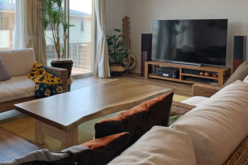 横幅はテレビより20~60cm大きいサイズを選ぶとバランスがよいです。好みによりますが、あまりテレビが大きくて頭でっかちな印象よりは、きれいな三角形くらいが見た目のバランスが美しく見えます。 高さは、少し目線が下がるようなサイズがベストです。見上げるような高さだと目が疲れやすくなります。自分が床に座るか、ソファに座るかで、TVボードの高さ選びも変わってきます。KAJAの家具は脚カットの加工も受けているので、低くしたい場合はご相談ください。