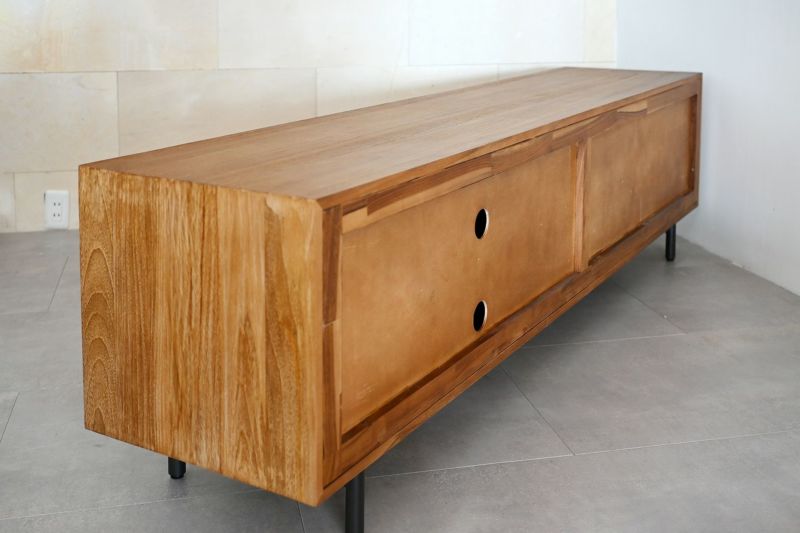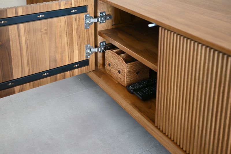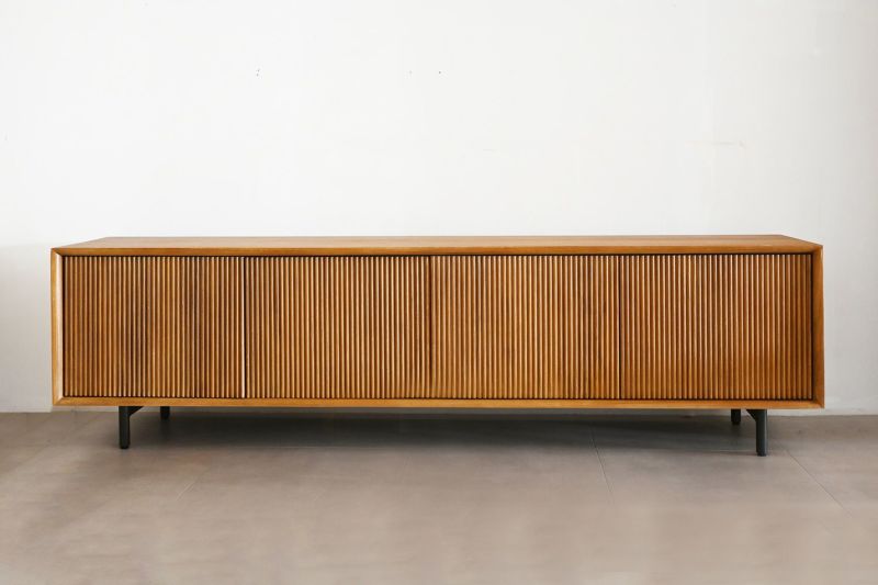ルーバーデザインのすっきりとしたローボード。チーク材を使用し温もりある天然木の雰囲気はそのままに、直線ラインが並ぶスタイリッシュなデザインです。モダンなインテリアとも相性よく、優美な印象を与えます。脚は黒いスチール製。チーク材の素材感を引き立てます。