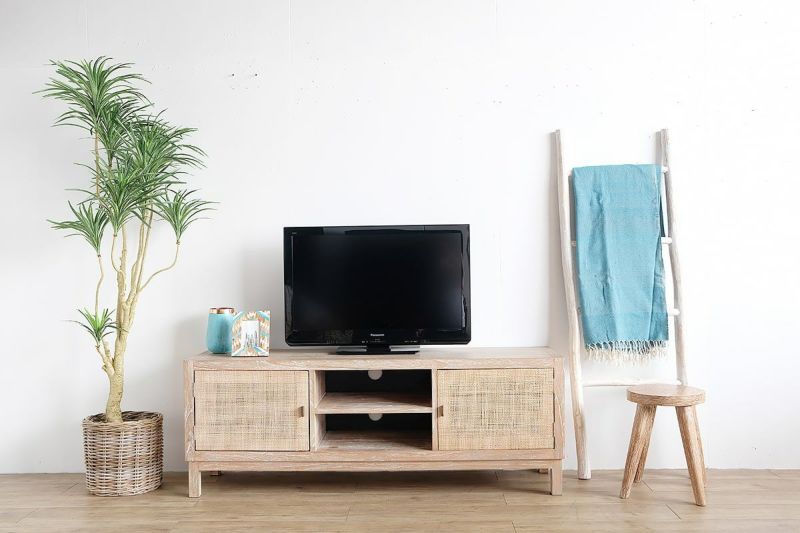 ラタンと天然木の組み合わせが優しいナチュラルな印象を与えてくれるテレビボード。扉部分と、側面にもラタンがあしらわれているので見た目もスマート。ラタンの扉は通気性が良いので、中に熱や空気がこもらないのも魅力のひとつです。ラタンの扉部分は赤外線を通すので、閉めた状態でもリモコン操作が可能です。フレンチカントリーにもよくあう、ホワイトウォッシュのカラー。ナチュラルテイストなお部屋にぴったりです。あたたかみのあるデザインがお部屋全体をやわらかい雰囲気で包みます。