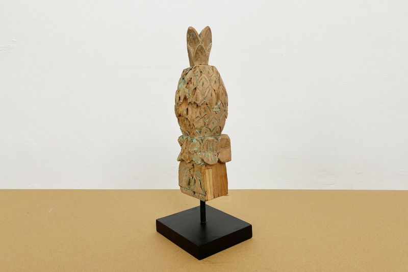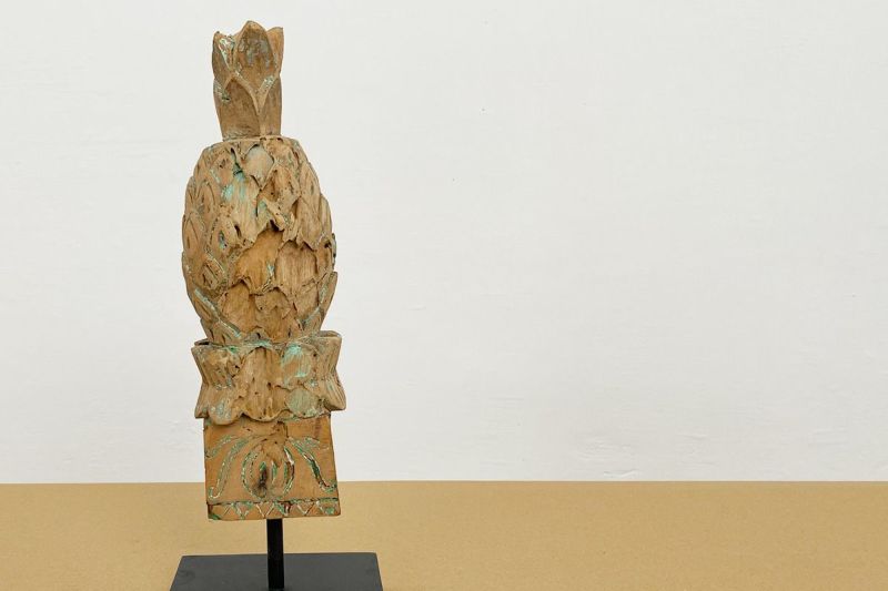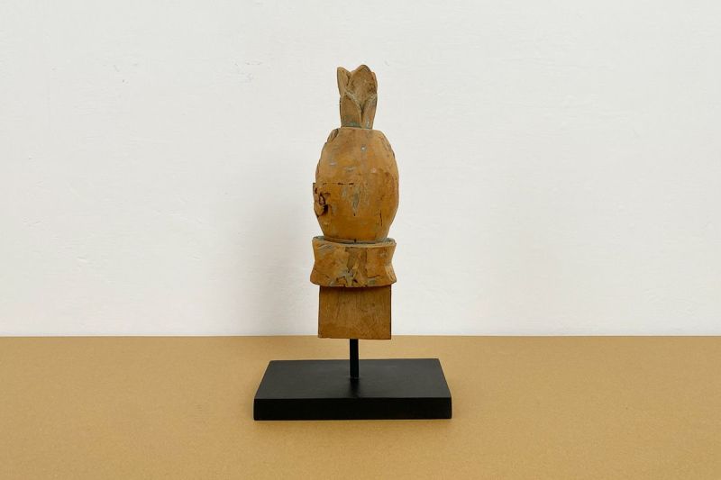 長い時間を経て味わいを増した、木のクラフトオブジェ。インドネシアの伝統建築に使われていた装飾パーツを再構成したもので、果実のようなフォルムが印象的です。所々に残るペイントや削れた質感が、時の流れと職人の手仕事の跡を物語ります。置くだけで空間に温もりとストーリーを添える、アートピースのような存在感です。