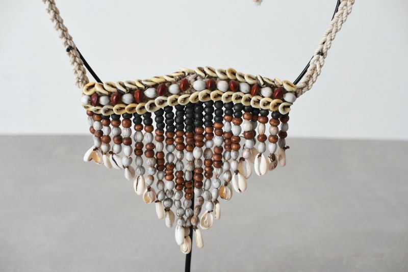 貝殻の宝石や身体装飾品で知られるパプアニューギニアの人々の様々な伝統的な儀式で使用され続けている首飾りをモチーフに作られたオブジェです。 ネックレスは、全てハンドメイド。ロープの裏地に織り込まれたさまざまな種類の貝殻を使用して、一つ一つ丁寧に作られています。