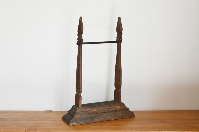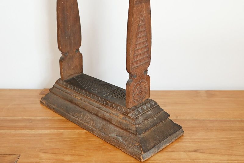 長い年月を経たチーク古材を使用し、手仕事の温もりを感じる装飾的な柱が美しいディスプレイスタンド。もともとは建具の一部として使われていた素材をリメイクした一点もので、経年変化による木の表情や彫りの風合いが独特の存在感を放ちます。