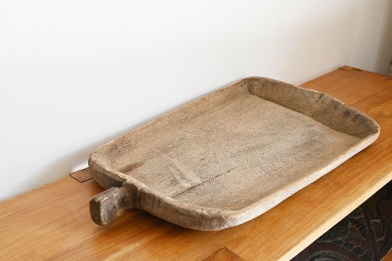 パンやフルーツなどをさりげなく置くだけで絵になる存在感があり、日常の中にちょっとしたリゾート感を添えてくれるアイテムです。ハンドメイドのため、木目や色合いには個体差があり、それぞれが一点物の表情を持っています。使うほどに深みを増すチーク材の魅力を、暮らしの中でじっくり味わえるアイテムです。