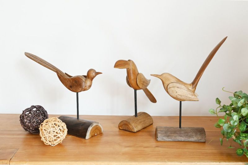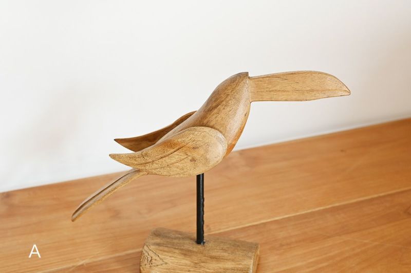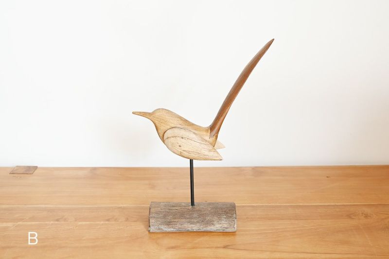 天然木を使い、ひとつひとつ丁寧に彫られたバードモチーフの木製オブジェ。丸みのあるシルエットと伸びやかな尾のラインが特徴で、素朴な味わいとともにどこかユーモラスな表情も感じられます。自然素材ならではの温かみがあり、リビングや玄関、寝室など、どんな空間にも穏やかな存在感を添えてくれます。