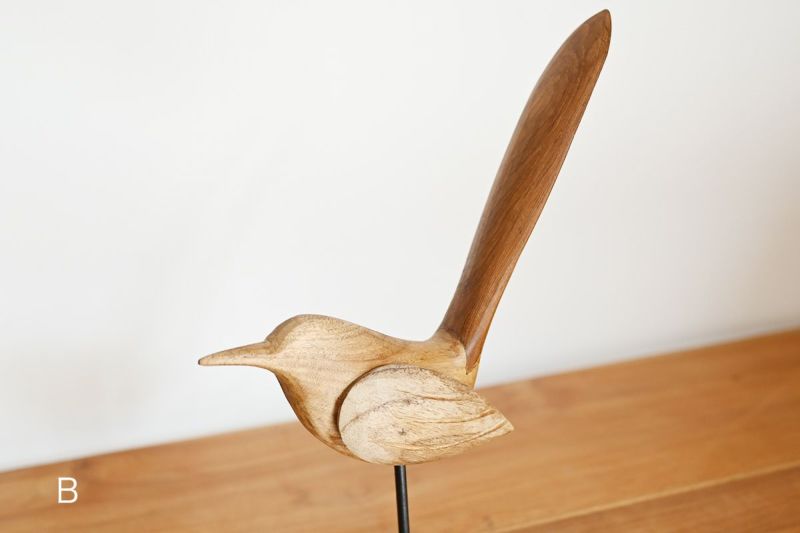 天然木を使い、ひとつひとつ丁寧に彫られたバードモチーフの木製オブジェ。丸みのあるシルエットと伸びやかな尾のラインが特徴で、素朴な味わいとともにどこかユーモラスな表情も感じられます。自然素材ならではの温かみがあり、リビングや玄関、寝室など、どんな空間にも穏やかな存在感を添えてくれます。