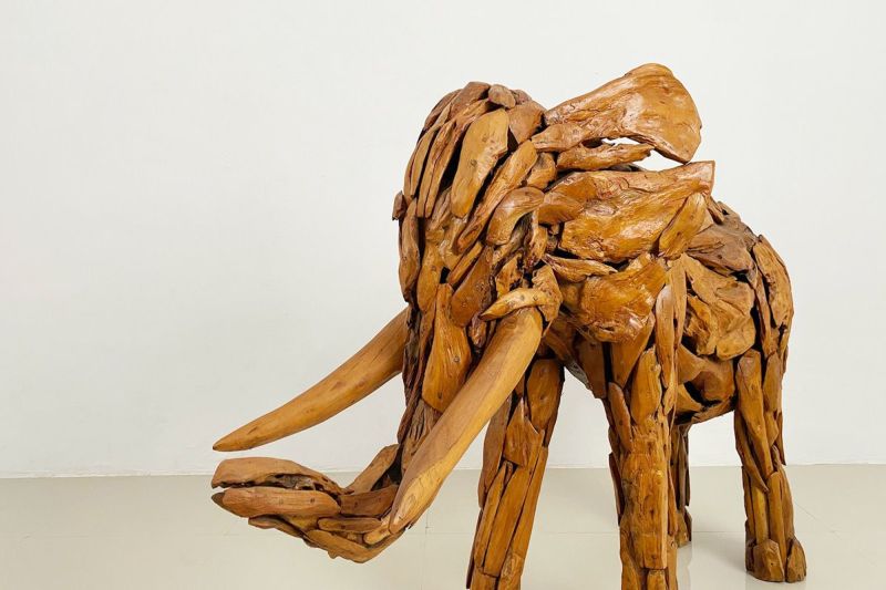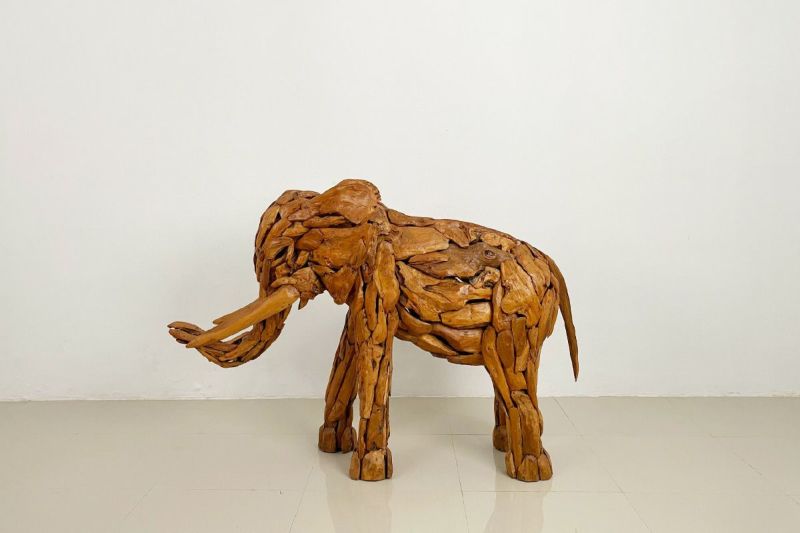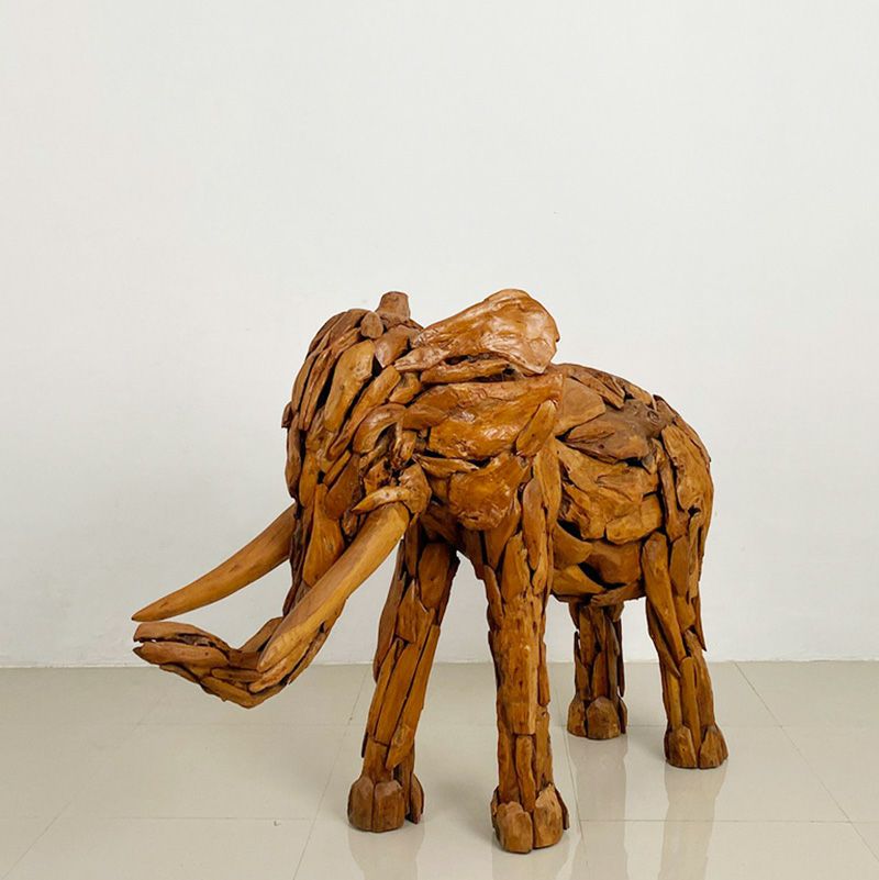 長い年月を経て味わいを増したチーク古材から生まれた象のモニュメント。木肌の豊かな表情や深みのある色合いは、それぞれの木が歩んできた歴史を物語ります。手仕事ならではの繊細な造形と力強さが調和し、見る者を惹きつける圧倒的な存在感を放ちます。