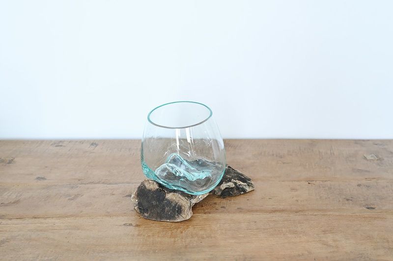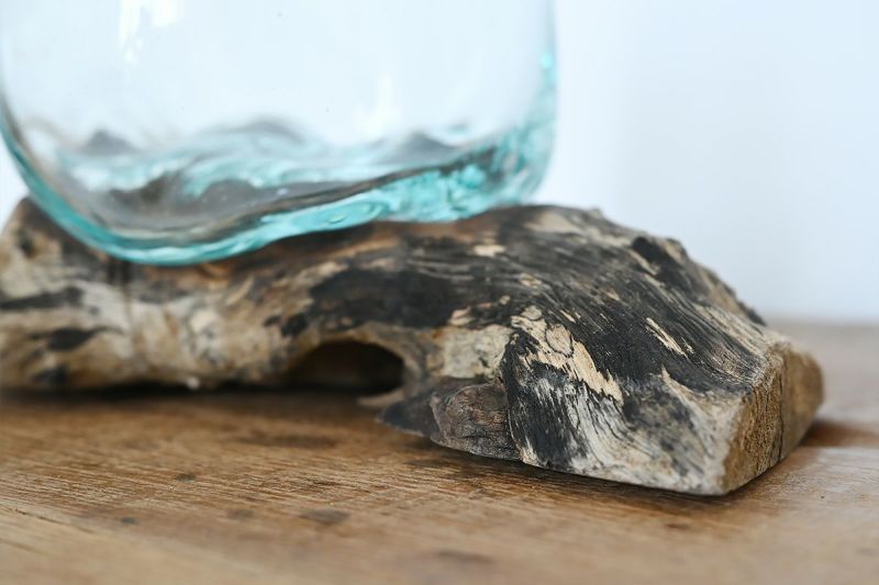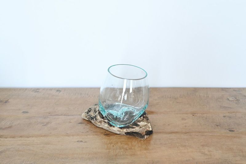 流木にガラスボウルをそのまま当て込んで、型取りをした他にはない独特のかたちのガラスベースです。個性的な木の土台は、オブジェのようでもあり、そのまま飾っても、雰囲気のあるインテリアとして役立ちます。また、見る角度によって、いろいろな表情を見せます。ひとつひとつ形が異なる一点もののアイテムです。